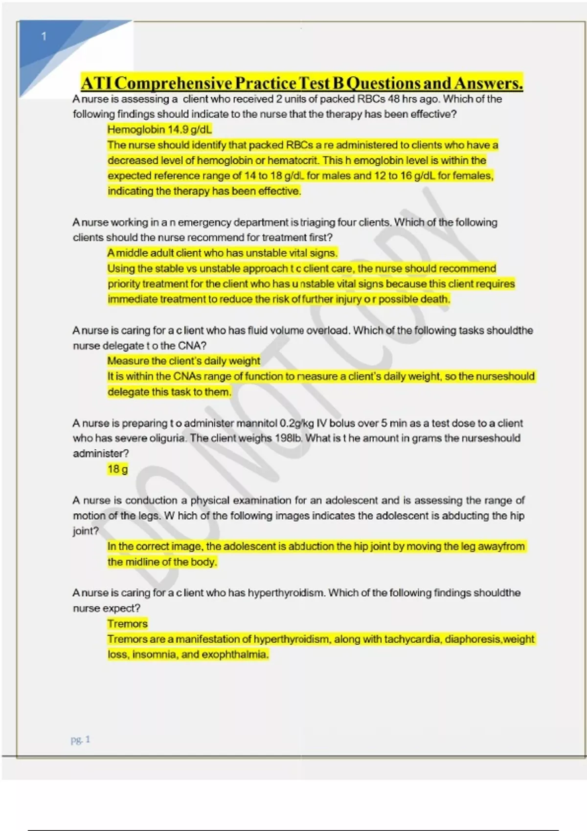 A nurse is assessing a client who received 2 units of packed RBCs 48 hrs ago. Which of the following findings should indicate to the nurse that the therapy has been effective? Hemoglobin 14.9 g/dL The nurse should identify that packed RBCs a re administered to clients who have a decreased level of hemoglobin or hematocrit. This h emoglobin level is within the expected reference range of 14 to 18 g/dL for males and 12 to 16 g/dL for females, indicating the therapy has been effective. A nurse working in a n emergency department is triaging four clients. Which of the following clients should the nurse recommend for treatment first? A middle adult client who has unstable vital signs. Using the stable vs unstable approach t o client care, the nurse should recommend priority treatment for the client who has u nstable vital signs because this client requires immediate treatment to reduce the risk of further injury o r possible death. A nurse is caring
