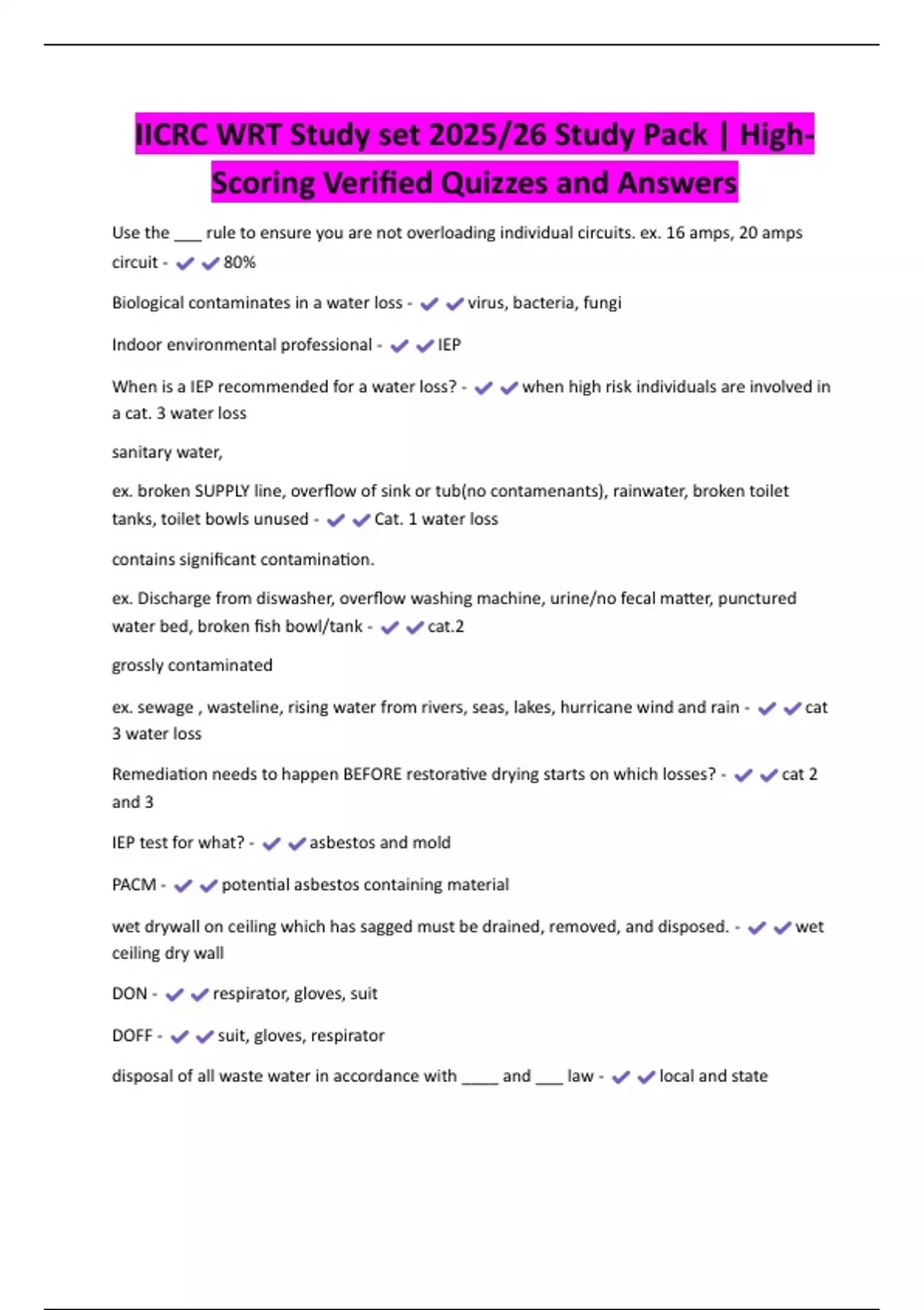 IICRC WRT Prep Guide 2025/26 | Latest Verified Quizzes and Answers | A+ Guarantee