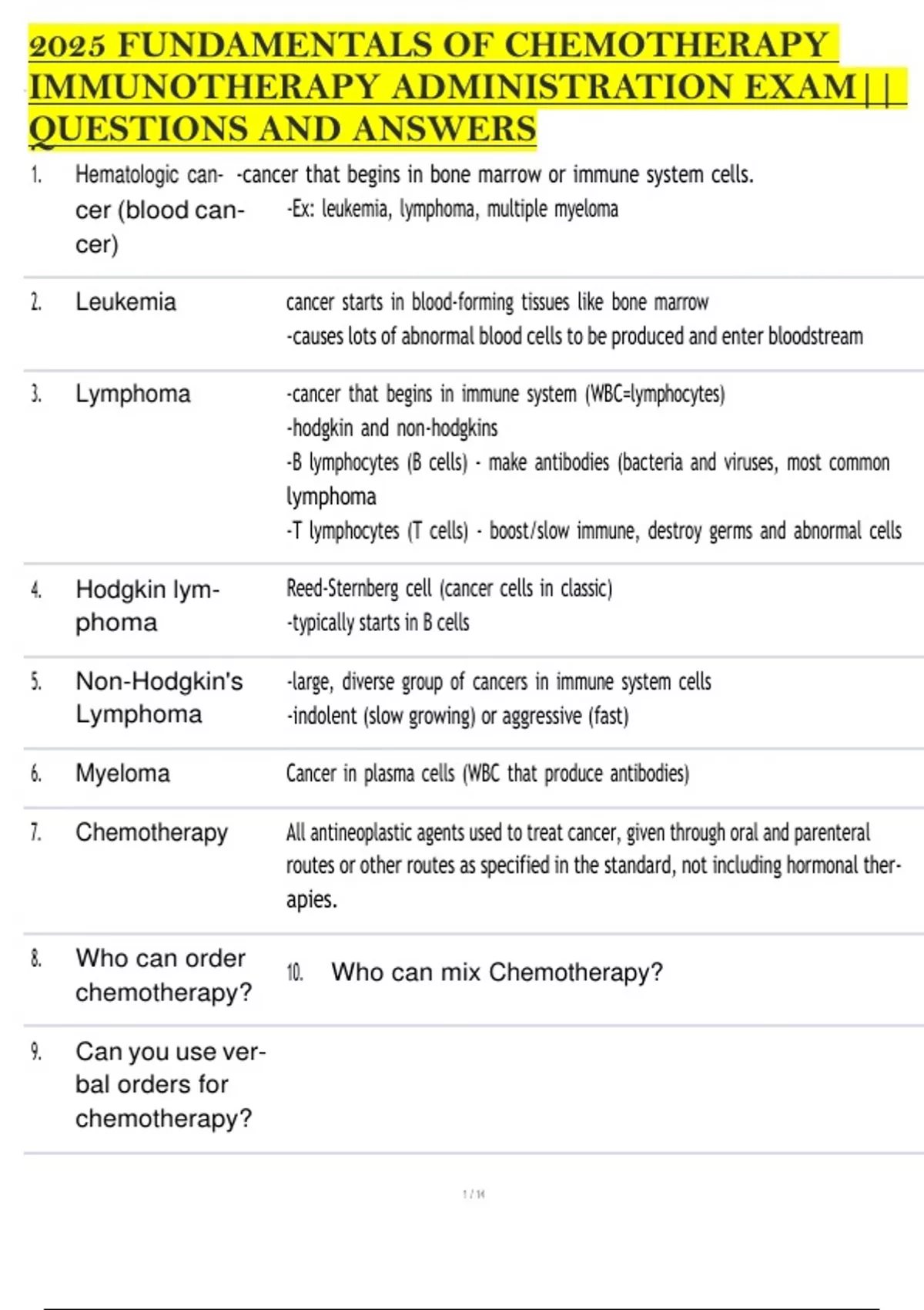 2025 FUNDAMENTALS OF CHEMOTHERAPY IMMUNOTHERAPY ADMINISTRATION EXAM|| QUESTIONS AND ANSWERS 1. Hematologic can- -cancer that begins in bone marrow or immune system cells. cer (blood can- cer) -Ex: leukemia, lymphoma, multiple myeloma 2. Leukemia cancer starts in blood-forming tissues like bone marrow -causes lots of abnormal blood cells to be produced and enter bloodstream