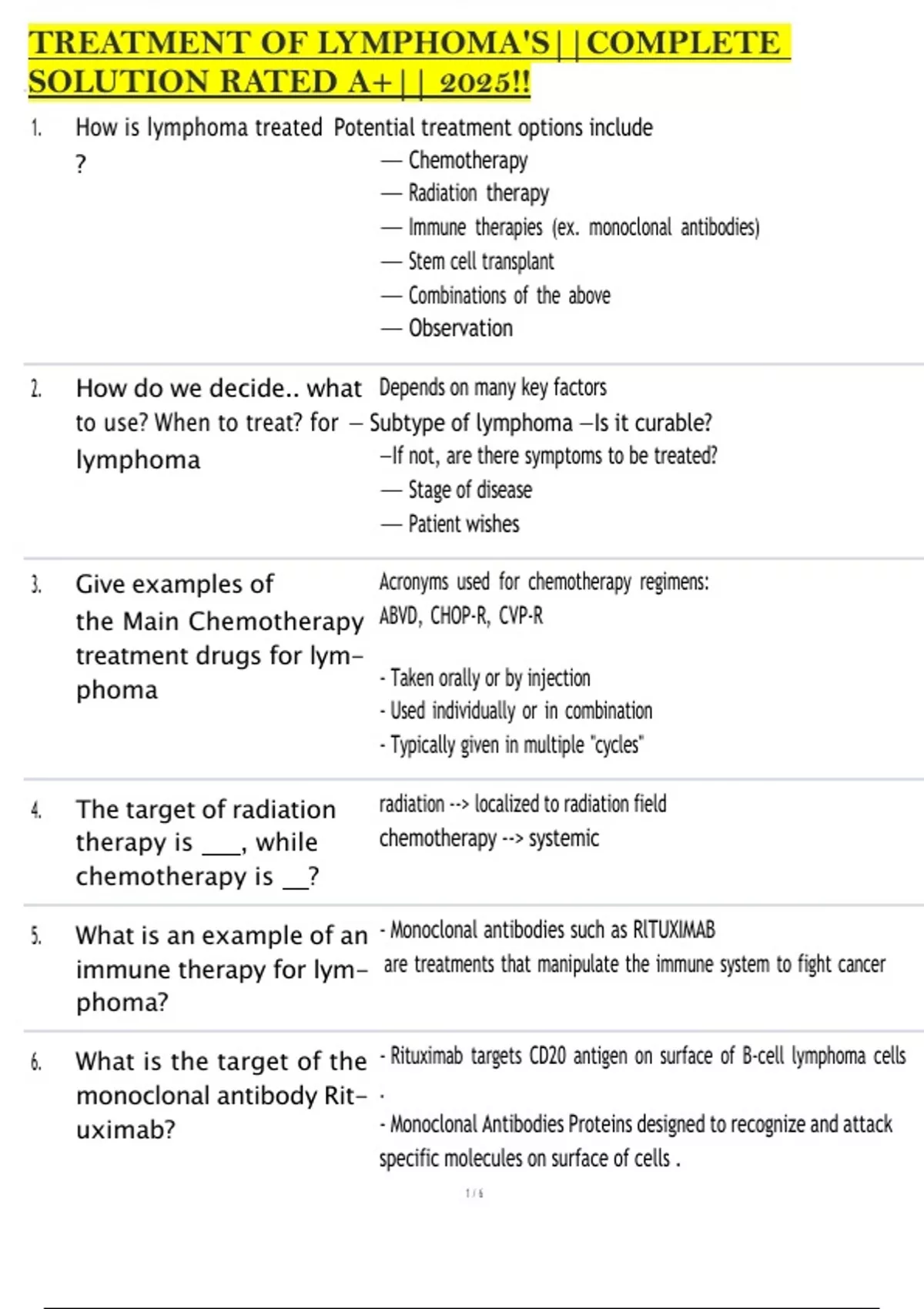 TREATMENT OF LYMPHOMA'S||COMPLETE SOLUTION RATED A+|| 2025!! 1. How is lymphoma treated Potential treatment options include ? 2. How do we decide.. what — Chemotherapy — Radiation therapy — Immune therapies (ex. monoclonal antibodies) — Stem cell transplant — Combinations of the above — Observation Depends on many key factors to use? When to treat? for — Subtype of lymphoma —Is it curable? lymphoma 3. Give examples of the Main Chemotherapy treatment drugs for lym- phoma 4. The target of radiation therapy is , while chemotherapy is ? 5. What is an example of an immune therapy for lym- phoma? 6. What is the target of the monoclonal antibody Rit- uximab? —If not, are there symptoms to be treated? — Stage of disease — Patient wishes Acronyms used for chemotherapy regimens: ABVD, CHOP-R, CVP-R - Taken orally or by injection - Used individually or in combination - Typically given in multiple "cycles" radiation --> localized to radiation field chemotherapy --> systemic - Monoclonal antibodies such as RlTUXIMAB are treatments that manipulate the immune system to fight cancer - Rituximab targets CD20 antigen on surface of B-cell lymphoma cells . - Monoclonal Antibodies Proteins designed to recognize and attack specific molecules on surface of cells .