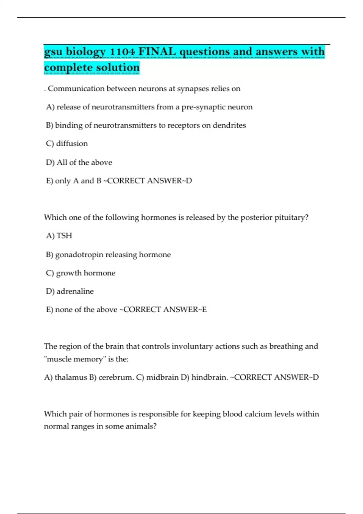 Ace your Georgia State University Biology 1104 final exam with this complete solution set! Includes verified multiple-choice questions and detailed answers covering hormones, nervous system, reproductive biology, human anatomy, and evolution. Ideal for last-minute review or thorough test prep—trusted by GSU students for exam success.