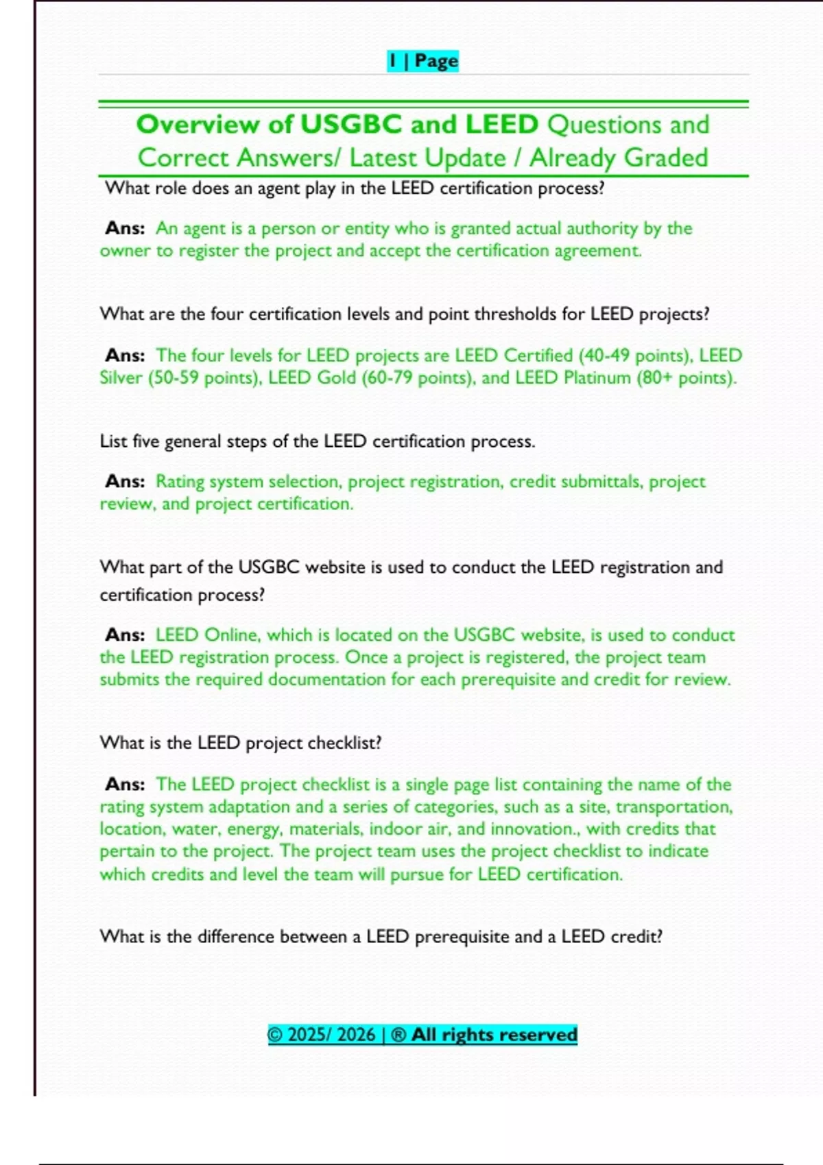 This document contains up-to-date questions and correct answers focused on the U.S. Green Building Council (USGBC) and the LEED certification system, essential for LEED Green Associate and AP candidates. It covers LEED rating systems, certification processes, project roles, prerequisites, credits, point thresholds, and definitions such as albedo, synergy, and CIR. Ideal for those preparing for LEED accreditation exams or needing a detailed glossary and structural overview of green building certification.