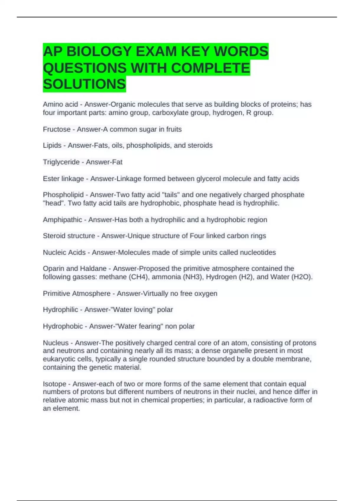 Hydrophobic - Answer-"Water fearing" non polar