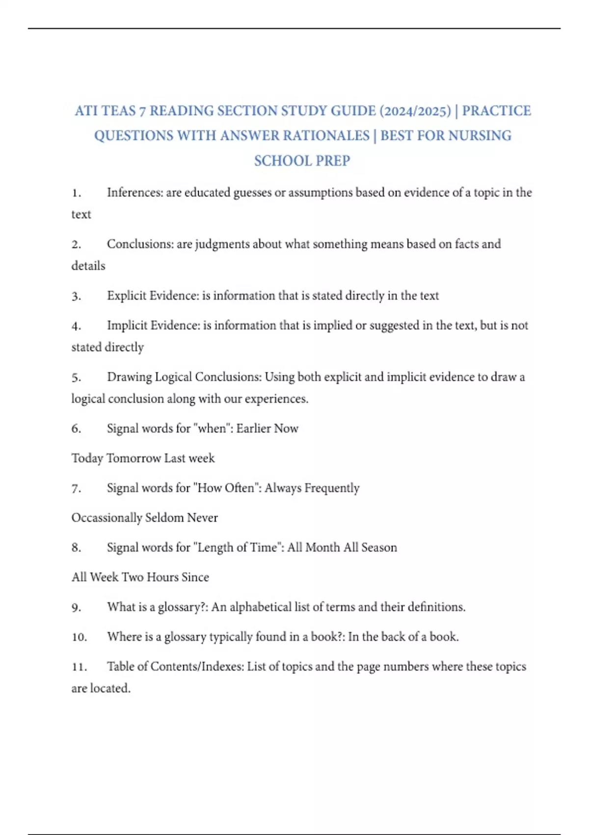 Sharpen your skills and boost your confidence with this ATI TEAS 7 Reading Study Guide, crafted for the 2024/2025 testing cycle. This focused resource includes TEAS-style reading comprehension questions, each with verified answers and detailed rationales, so you can master key topics like main idea, inference, author’s purpose, and text structure. Perfect for students aiming to score high on the Reading section of the TEAS 7 and get into competitive nursing or allied health programs. What’s Inside: 50+ practice questions tailored to the Reading section Focus on comprehension, analysis, and interpretation Answer key with detailed rationales Aligned with the ATI TEAS 7 blueprint Downloadable, printable, and mobile-friendly format Best For: TEAS 7 test-takers in 2024/2025 Nursing and health sciences applicants Focused prep for the Reading portion ATI TEAS 7 Reading section questions TEAS Reading study guide PDF 2024 Best TEAS 7 reading comprehension practice TEAS exam reading prep for nursing school TEAS 7 full reading practice with answers