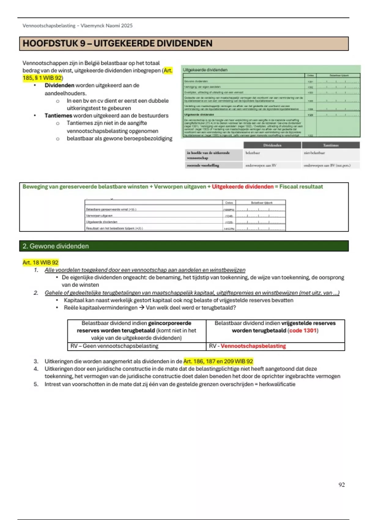 DEEL 4/4 samenvatting vennootschapsbelasting (slides, boek, notities en oefeningen) - Bachelor accountancy-fiscaliteit Artevelde + aanduiding wat er op het examen stond juni 2025 Deel 4 bevat: - HOOFDSTUK 9 – UITGEKEERDE DIVIDENDEN - HOOFDSTUK 10 – EERSTE BEWERKING: VASTSTELLING VAN DE FISCALE WINST/HET FISCALE VERLIES - HOOFDSTUK 11 – AFTREKVERBOD - HOOFDSTUK 12 – TWEEDE BEWERKING - HOOFDSTUK 13 – DERDE BEWERKING: AFTREK VAN NIET-BELASTBARE BESTANDDELEN - HOOFDSTUK 14 – VIERDE BEWERKING: AFTREK VAN DBI - HOOFDSTUK 16 – ZESDE BEWERKING: INVESTERINGSAFTREK - HOOFDSTUK 18 – ACHTSTE BEWERKING: OVERGEDRAGEN DBI-AFTREK - HOOFDSTUK 20 – TIENDE BEWERKING: AFTREK VAN VORIGE VERLIEZEN - HOOFDSTUK 23 – VERREKENING VAN VOORHEFFINGEN EN VOORAFBETALINGEN