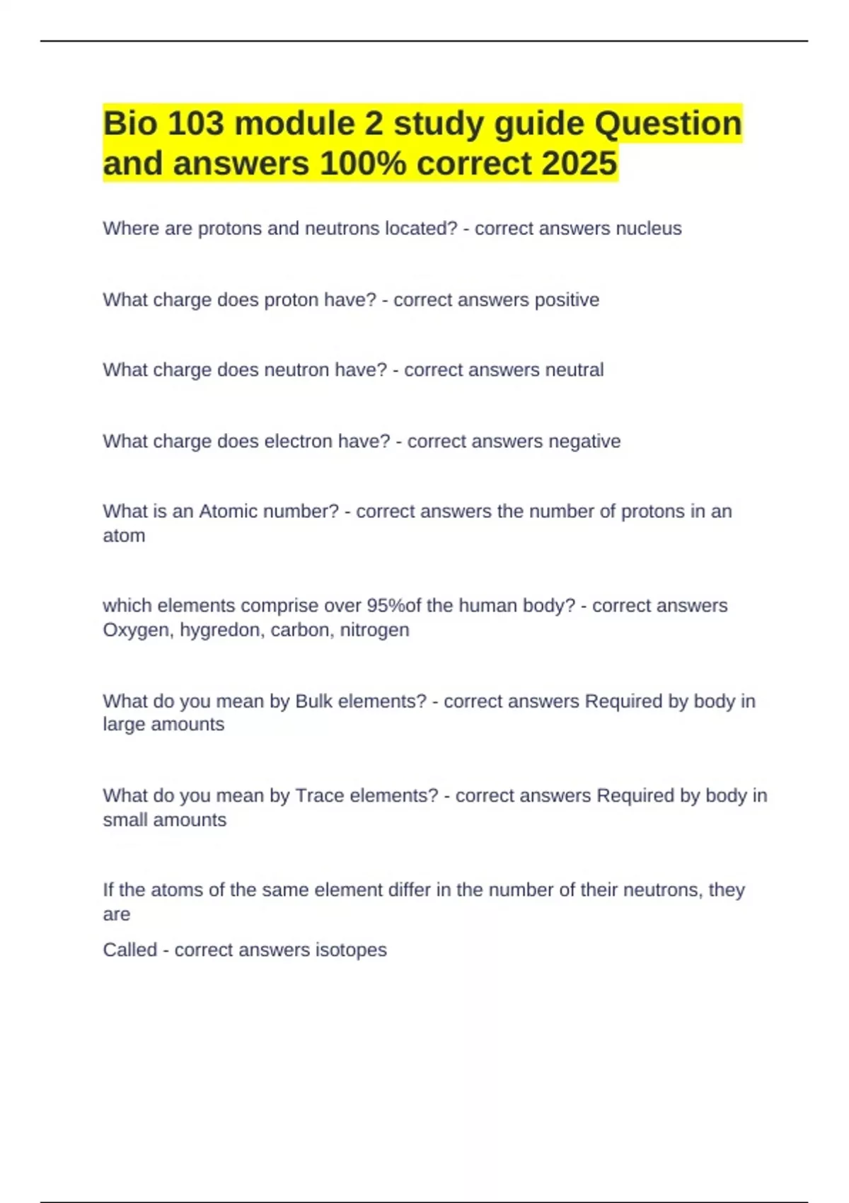 Bio 103 module 2 study guide Question and answers 100% correct 2025 Where are protons and neutrons located? - correct answers nucleus What charge does proton have? - correct answers positive What charge does neutron have? - correct answers neutral What charge does electron have? - correct answers negative What is an Atomic number? - correct answers the number of protons in an atom which elements comprise over 95%of the human body? - correct answers Oxygen, hygredon, carbon, nitrogen What do you mean by Bulk elements? - correct answers Required by body in large amounts What do you mean by Trace elements? - correct answers Required by body in small amounts If the atoms of the same element differ in the number of their neutrons, they are Called - cor