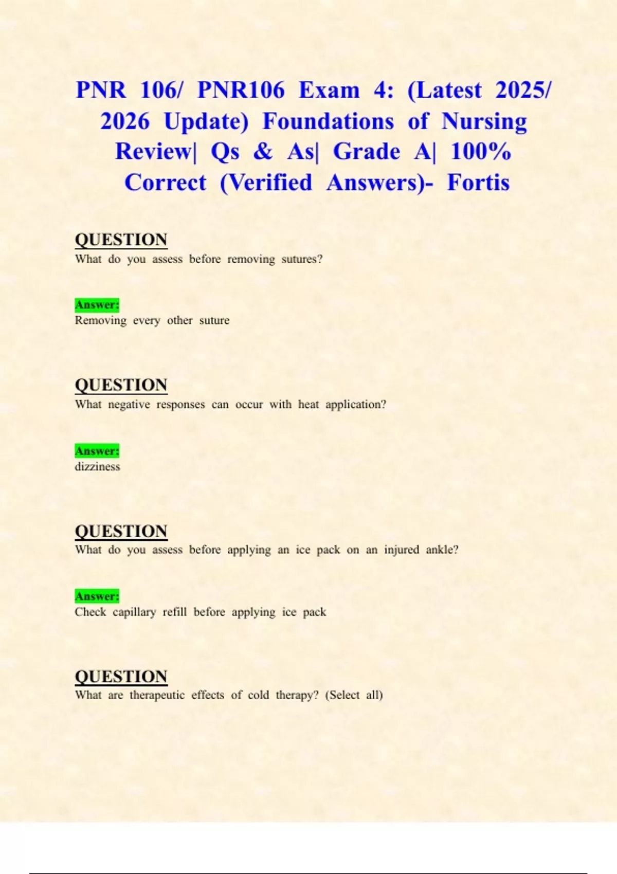 PNR 106/ PNR106 Exam 4: (Latest 2025/ 2026 Update) Foundations of Nursing Review| Qs & As| Grade A| 100% Correct (Verified Answers)- Fortis