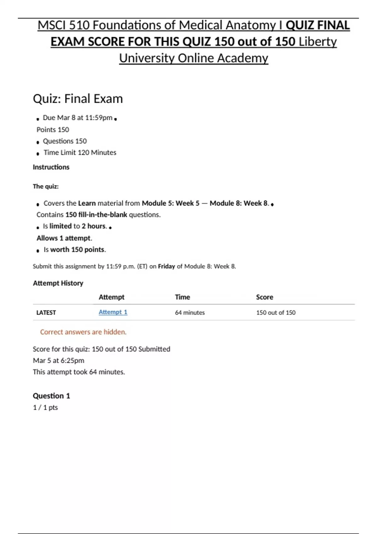 EXAM SCORE FOR THIS QUIZ 150 out of 150 Liberty