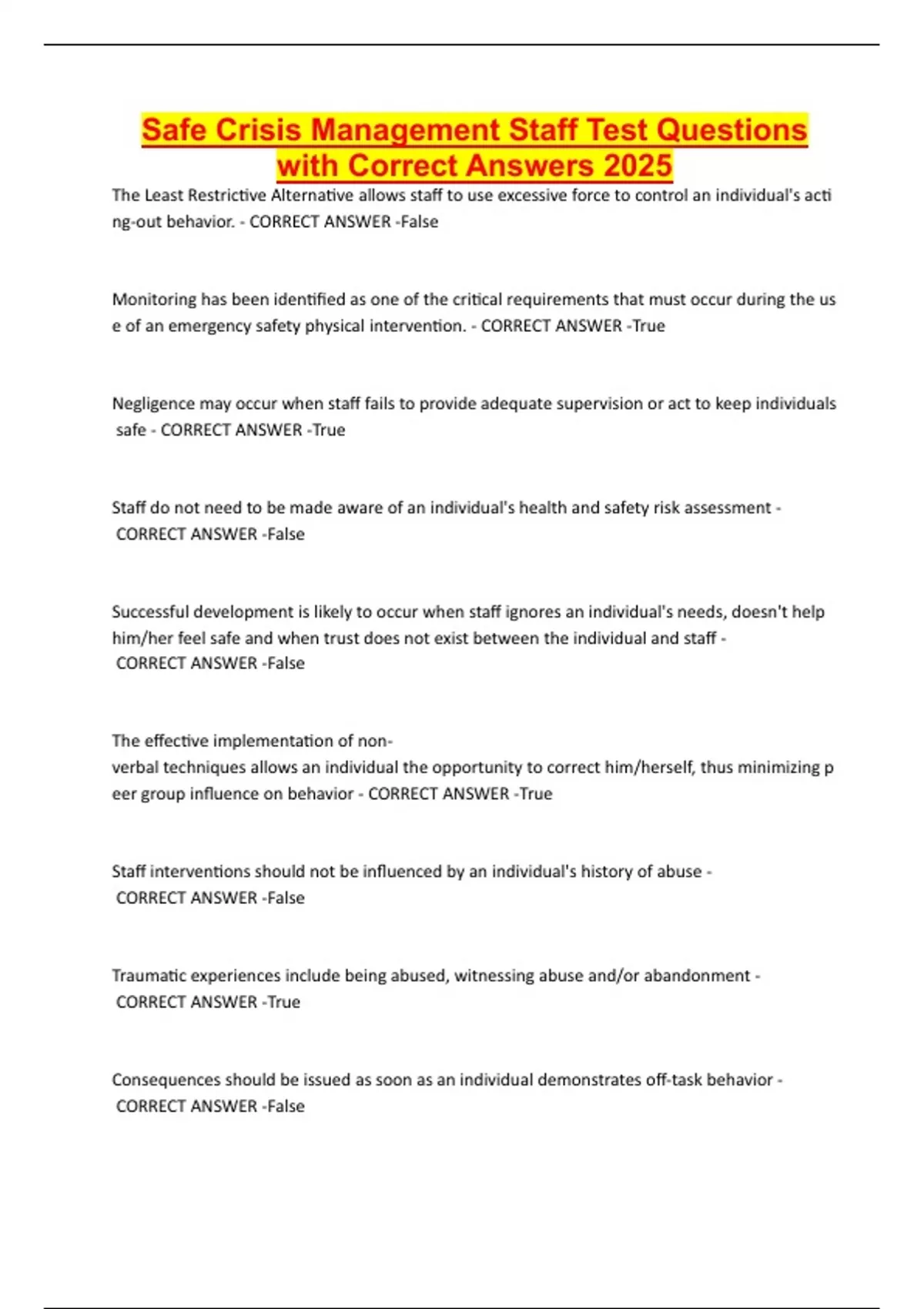 Safe Crisis Management Staff Test Questions with Correct Answers 2025