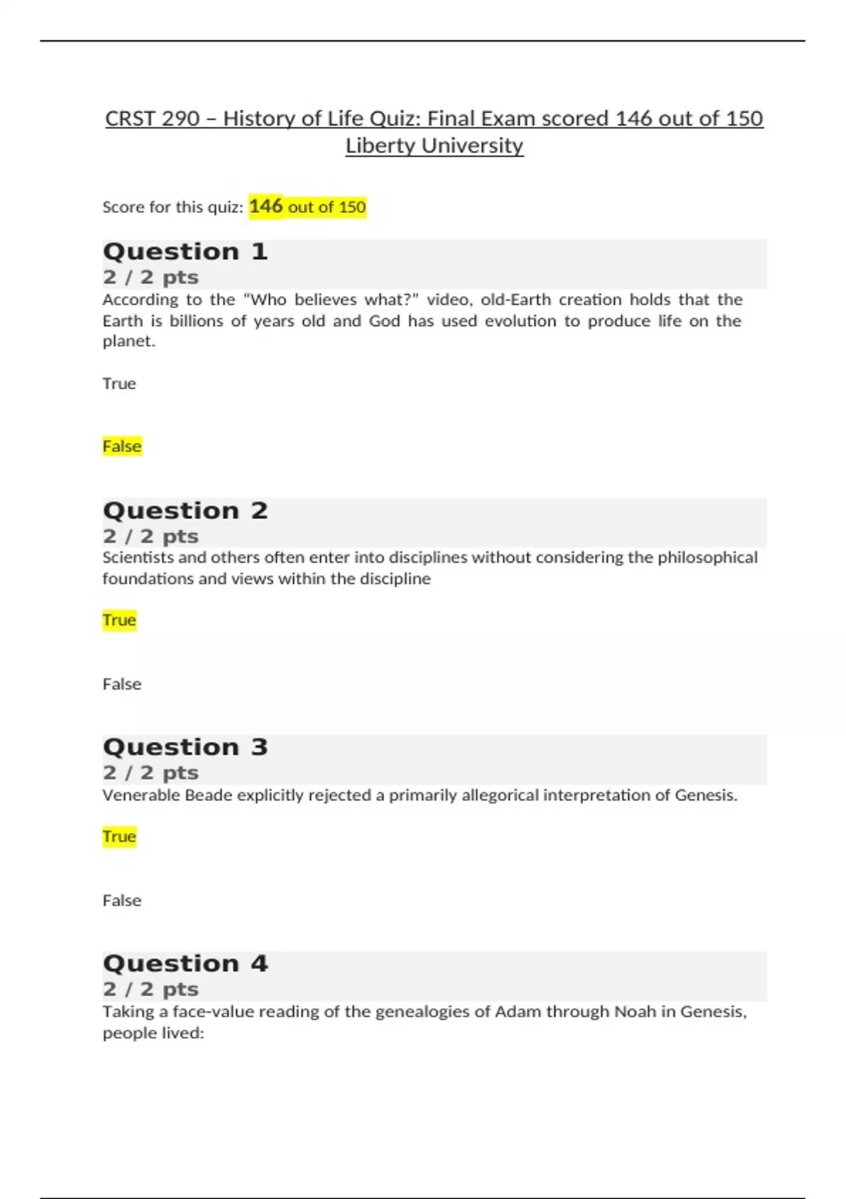 CRST 290 – History of Life Quiz: Final Exam scored 146 out of 150