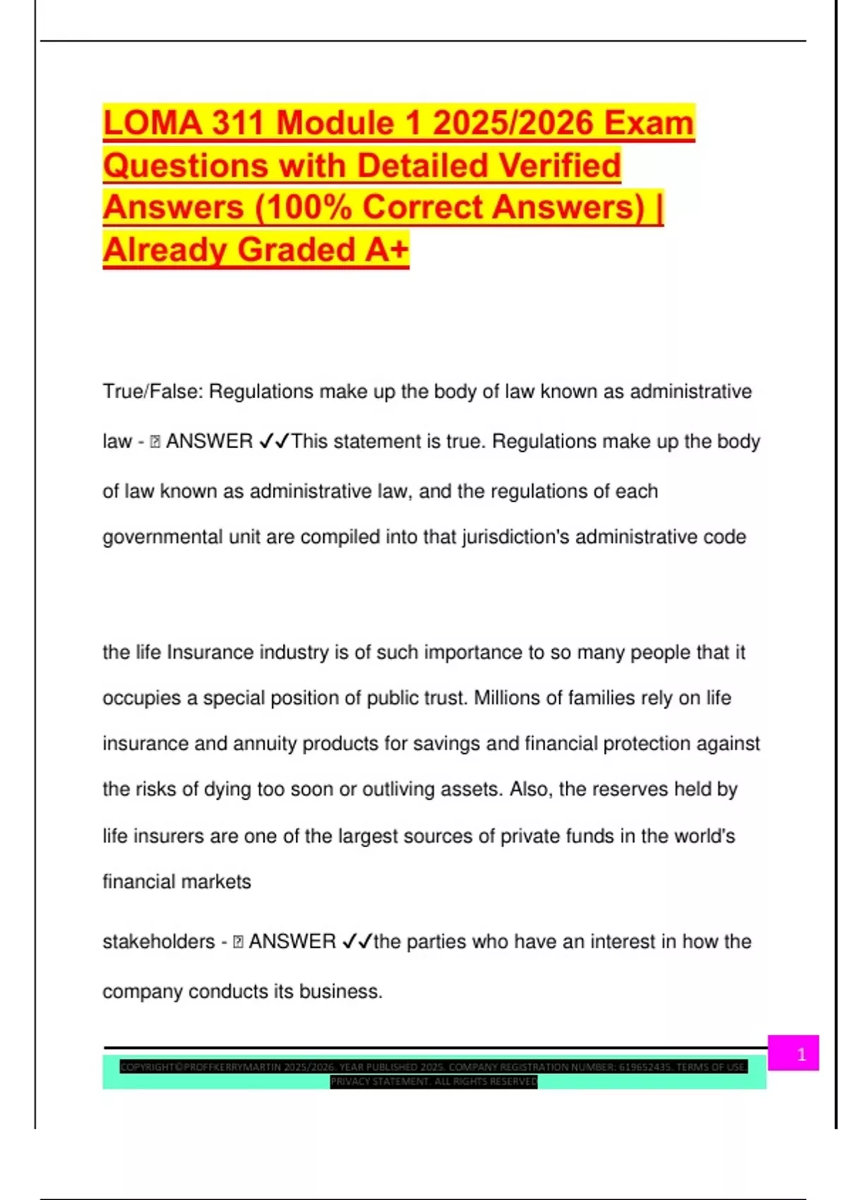 LOMA 311 Module 1 2025/2026 Exam Questions with Detailed Verified Answers (100% Correct Answers) | Already Graded A+ True/False: Regulations make up the body of law known as administrative law -