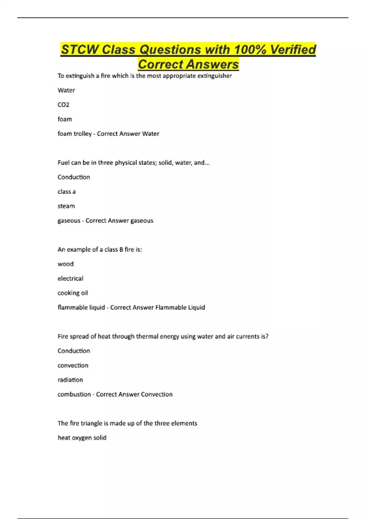 STCW Class Questions with 100% Verified Correct Answers To extinguish a fire which is the most appropriate extinguisher Water CO2 foam foam trolley - Correct Answer Water Fuel can be in three physical states; solid, water, and... Conduction class a steam gaseous - Correct Answer gaseous An example of a class B fire is: wood electrical cooking oil flammable liquid - Correct Answer Flammable Liquid Fire spread of heat through thermal energy using water and air currents is? Conduction convection radiation combustion - Correct Answer Convection The fire triangle is made up of the three elements heat oxygen solid oxygen fuel heat fuel heat inhibited chemical reaction inhibited chemical reaction, fuel, oxygen - Correct Answer oxygen, fuel, heat Engine room housekeeping includes which of the following? - Correct Answer Storing combustible liquids in approved container Crew members need constant vigilance to prevent the loss of life and damage from fire? Fuel transfer crew transfers transfer