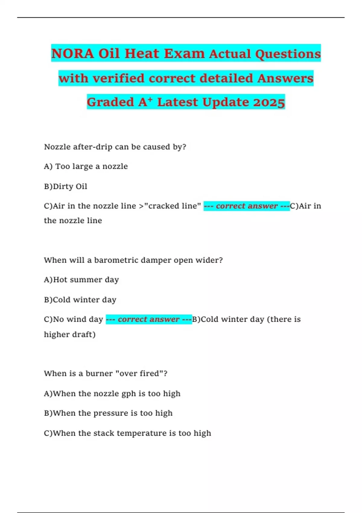 NORA Oil Heat Exam Actual Questions with verified correct detailed Answers Graded A+ Latest Update 2025 Nozzle after-drip can be caused by? A) Too large a nozzle B)Dirty Oil C)Air in the nozzle line >"cracked line" --- correct answer ---C)Air in the nozzle line When will a barometric damper open wider? A)Hot summer day B)Cold winter day C)No wind day --- correct answer ---B)Cold winter day (there is higher draft) When is a burner "over fired"? A)When the nozzle gph is too high B)When the pressure is too high C)When the stack temperature is too high D)All --- correct answer ---D) All