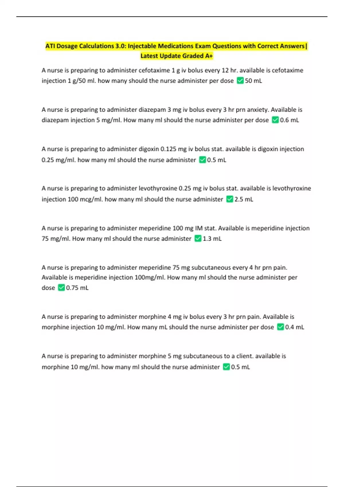 75 mg/ml. How many ml should the nurse administer 1.3 mL