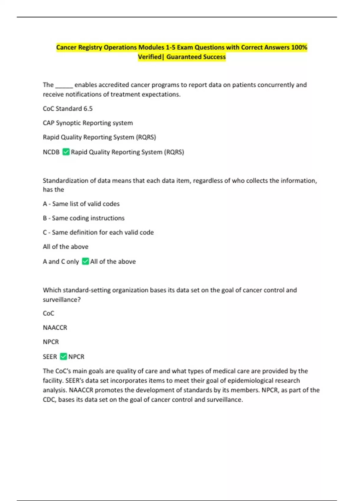 Cancer Registry Operations – Exam Questions with Correct Answers | Verified Study Resource for Cancer Registrar Certification
