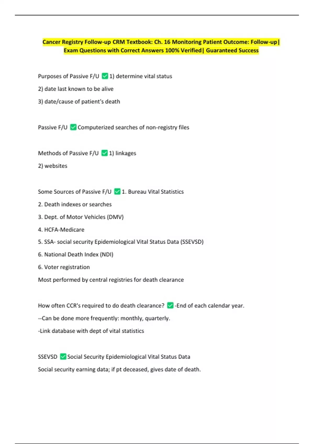 This document features verified exam questions and correct answers from Chapter 16 of the CRM textbook, focused on monitoring patient outcomes through follow-up processes. It emphasizes passive follow-up (F/U) methods, including computerized linkages and online sources, and details the key sources used—such as the Bureau of Vital Statistics, DMV, SSA, and the National Death Index. Ideal for exam preparation related to cancer registry follow-up protocols and outcome monitoring.