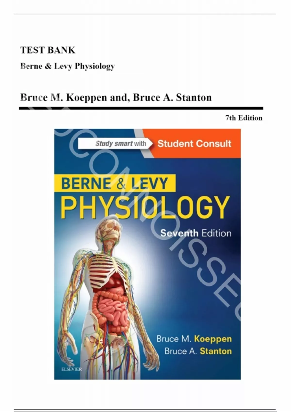 Test Bank for Berne and Levy Physiology, 7th Edition (Koeppen, 2018), Chapter 1-44 | All Chapters. Section 1: Cellular Physiology 1. Principles of Cell and Membrane Function 2. Homeostasis: Volume and Composition of Body Fluid Compartments 3. Signal Transduction, Membrane Receptors, Second Messengers, and Regulation of Gene Expression Section 2: The Nervous System 4. The Nervous System: Introduction to Cells and Systems 5. Generation and Conduction of Action Potentials 6. Synaptic Transmission 7. The Somatosensory System 8. The Special Senses 9. Organization of Motor Function 10. Higher Functions of the Nervous System 11. The Autonomic Nervous System and Its Central Control Section 3: Muscle 12. Skeletal Muscle Physiology 13. Cardiac Muscle 14. Smooth Muscle Section 4: The Cardiovascular System 15. Overview of Circulation 16. Elements of Cardiac Function 17. Properties of the Vasculature 18. Regulation of the Heart and Vasculature 19. Integrated Control of the Cardiovascular System Section 5: The Respiratory System 20. Structure and Function of the Respiratory System 21. Static Lung and Chest Wall Mechanics 22. Dynamic Lung and Chest Wall Mechanics Berne and Levy Physiology 7th Edition Koeppen 23. Ventilation (V.), Perfusion (Q.), and V./Q. Relationships 24. Oxygen and Carbon Dioxide Transport 25. Control of Respiration 26. Nonrespiratory Functions of the Lung Section 6: Gastrointestinal Physiology 27. Functional Anatomy and General Principles of Regulation in the Gastrointestinal Tract 28. The Cephalic, Oral, and Esophageal Phases of the Integrated Response to a Meal 29. The Gastric Phase of the Integrated Response to a Meal 30. The Small Intestinal Phase of the Integrated Response to a Meal 31. The Colonic Phase of the Integrated Response to a Meal 32. Transport and Metabolic Functions of the Liver Section 7: The Renal System 33. Elements of Renal Function 34. Solute and Water Transport along the Nephron: Tubular Function 35. Control of Body Fluid Osmolality and Volume 36. Potassium, Calcium, and Phosphate Homeostasis 37. Role of the Kidneys in the Regulation of Acid-Base Balance Section 8: The Endocrine and Reproductive Systems 38. Introduction to the Endocrine System 39. Hormonal Regulation of Energy Metabolism 40. Hormonal Regulation of Calcium and Phosphate Metabolism 41. The Hypothalamus and Pituitary Gland 42. The Thyroid Gland 43. The Adrenal Glands 44. The Male and Female Reproductive Systems