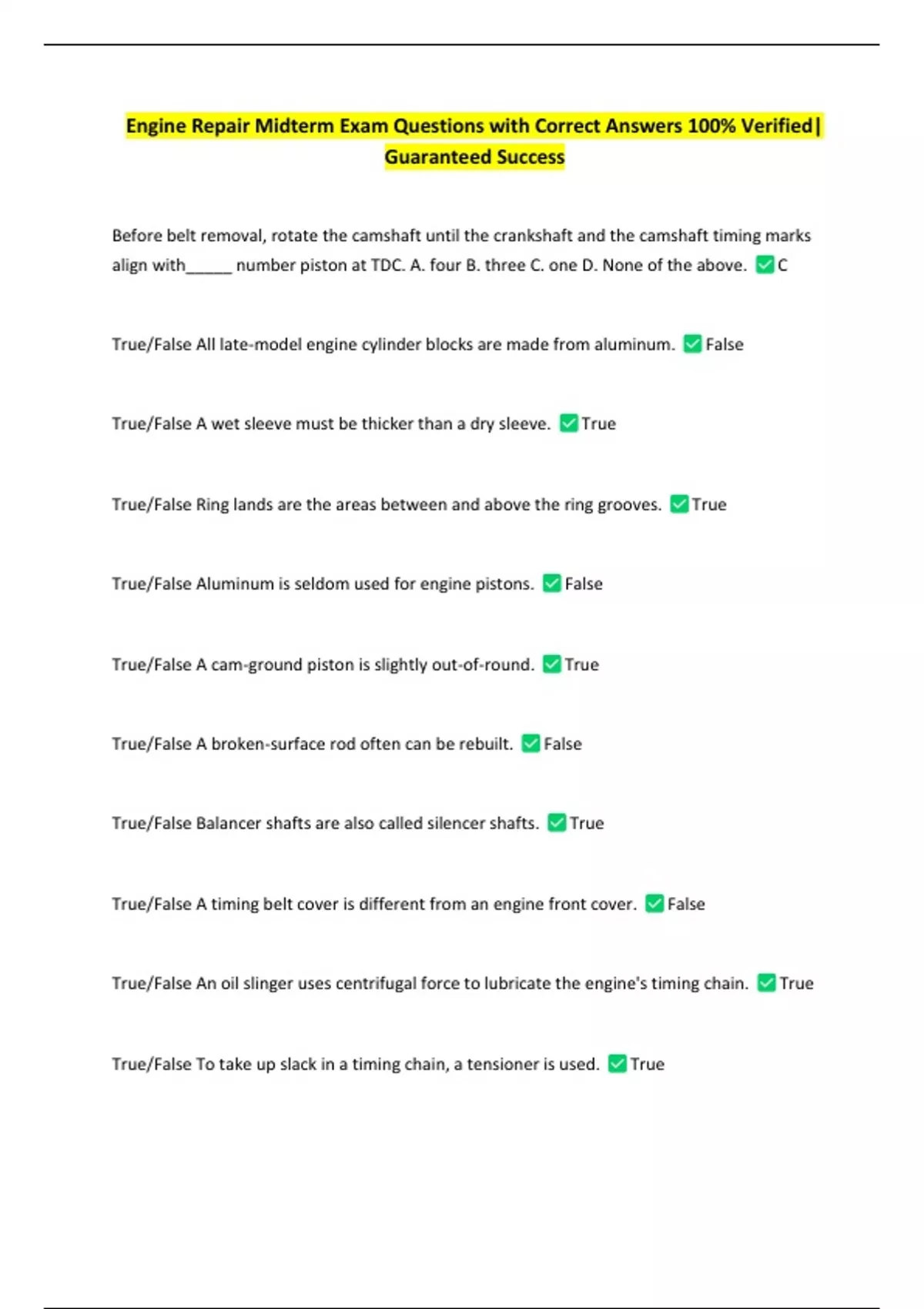 Engine Repair Midterm Exam Questions with Correct Answers 100% Verified|