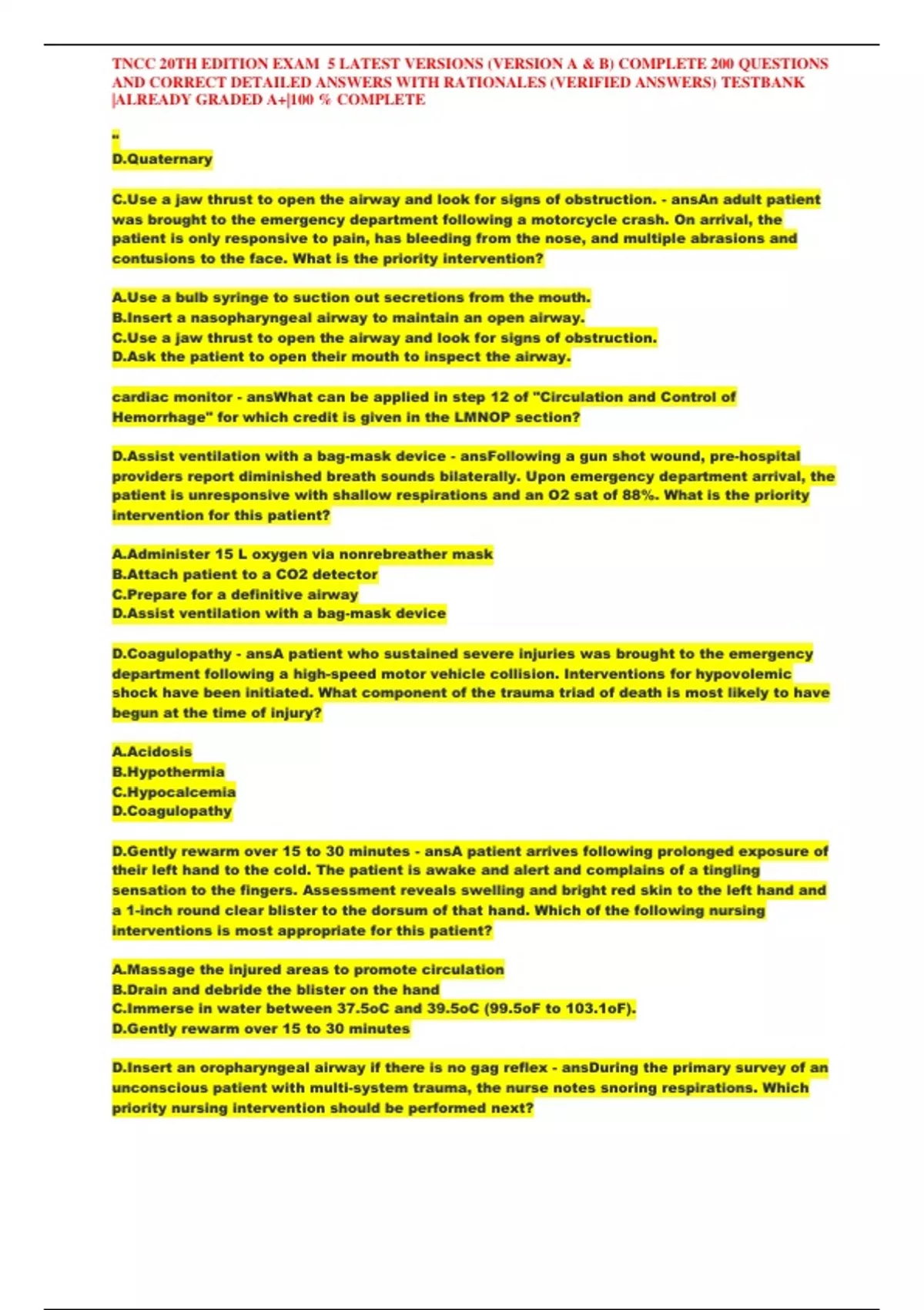 , TNCC 20TH EDITION EXAM 5 LATEST VERSIONS (VERSION A & B) COMPLETE 200 QUESTIONS