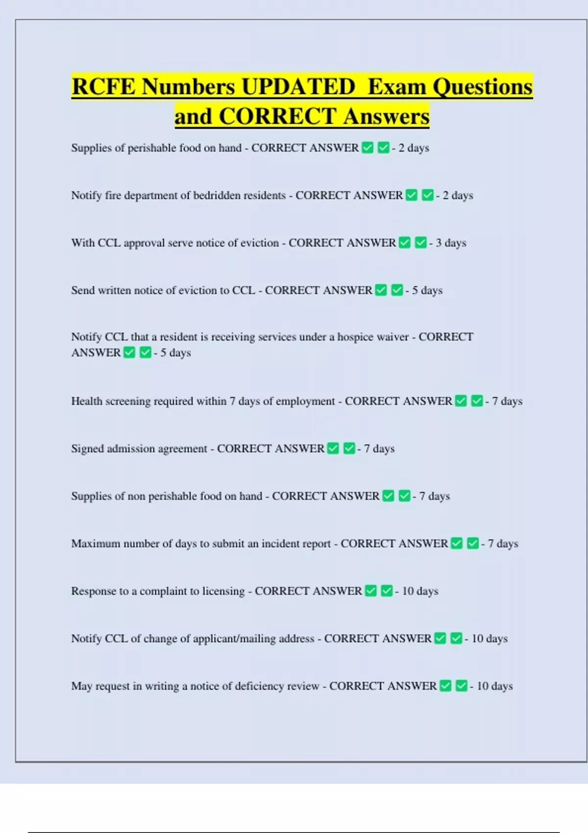 RCFE Numbers UPDATED Exam Questions and CORRECT Answers Supplies of perishable food on hand - CORRECT ANSWER - 2 days Notify fire department of bedridden residents - CORRECT ANSWER With CCL approval serve notice of eviction - CORRECT ANSWER - 2 days - 3 days Send written notice of eviction to CCL - CORRECT ANSWER - 5 days