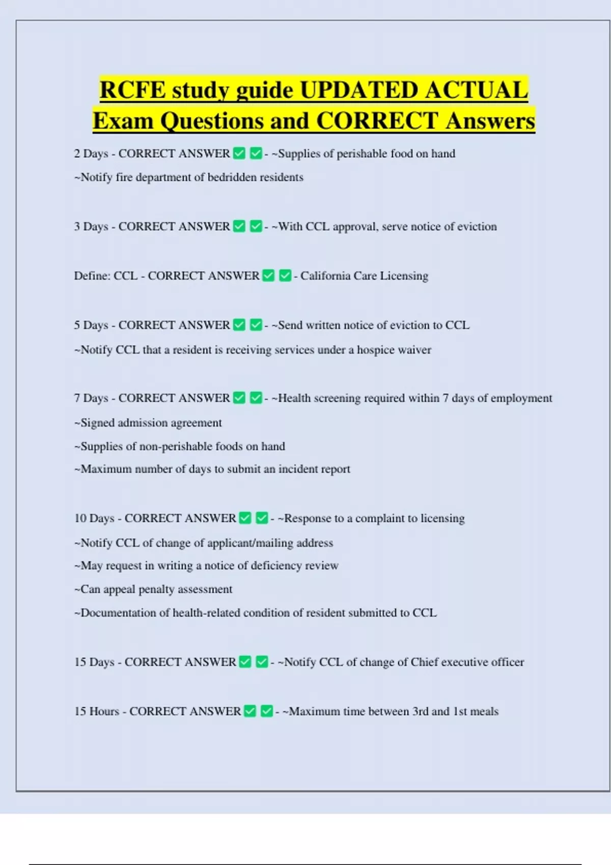 RCFE study guide UPDATED ACTUAL Exam Questions and CORRECT Answers 2 Days - CORRECT ANSWER - ~Supplies of perishable food on hand ~Notify fire department of bedridden residents 3 Days - CORRECT ANSWER Define: CCL - CORRECT ANSWER 5 Days - CORRECT ANSWER - ~With CCL approval, serve notice of eviction - California Care Licensing - ~Send written notice of eviction to CCL ~Notify CCL that a resident is receiving services under a hospice waiver