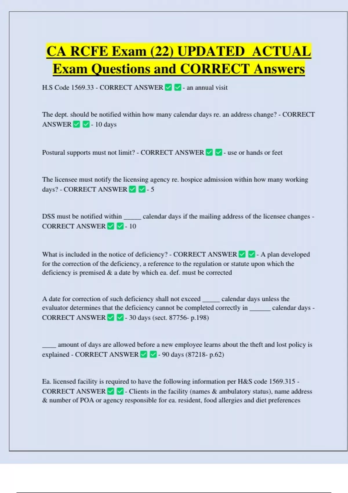 CA RCFE Exam (22) UPDATED ACTUAL Exam Questions and CORRECT Answers H.S Code 1569.33 - CORRECT ANSWER - 10 days - an annual visit The dept. should be notified within how many calendar days re. an address change? - CORRECT ANSWER Postural supports must not limit? - CORRECT ANSWER - use or hands or feet The licensee must notify the licensing agency re. hospice admission within how many working days? - CORRECT ANSWER - 5
