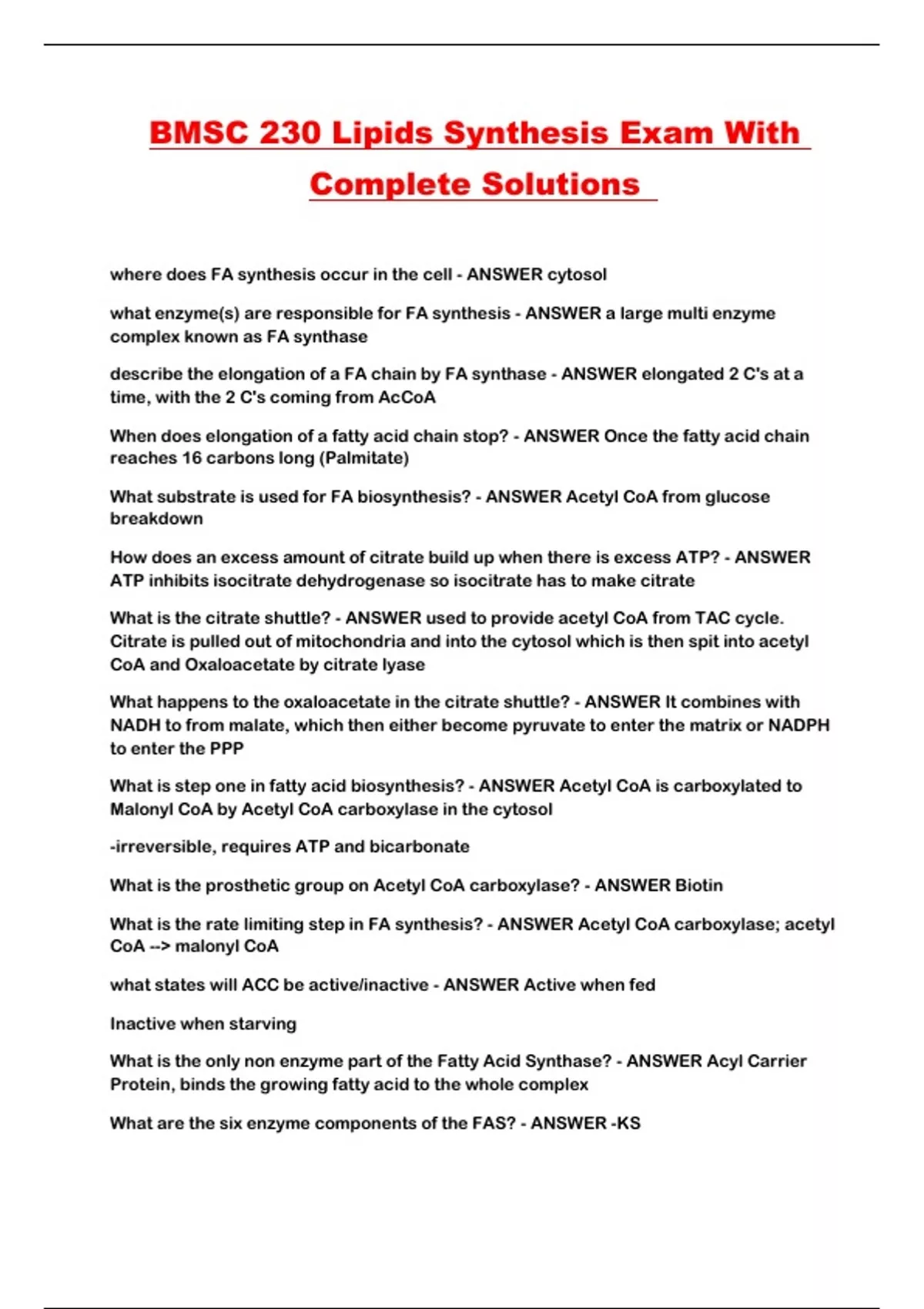 BMSC 230 Lipids Synthesis Exam With Complete Solutions ...