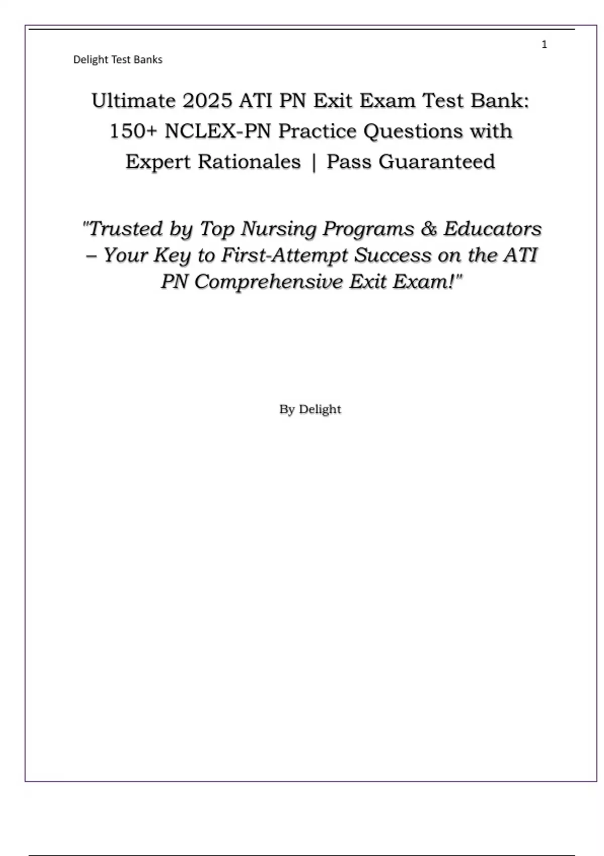 "ATI PN Comprehensive Exit Exam 2024 Test Bank | NCLEX-PN Prep | 150+ Practice Questions & Rationales | Prioritization, Pharmacology, Delegation, Clinical Judgment | Medical-Surgical, Maternal-Newborn, Mental Health Nursing | Verified Answers, Study Guides, Timed Practice Tests | Nursing School Success | Pass Guarantee | Updated for | Educator-Approved | Trusted by Nursing Programs | Score Improvement Strategies | HIPAA-Compliant Scenarios | Ethical Test Prep | Copyright-Free Content | Printable PDF | Instant Access | Critical Thinking Drills | Nursing Process Mastery | Pathophysiology Review | Lab Value Cheat Sheets | Risk Reduction Tactics | Patient Safety Focus | NCLEX-Style Questions | First-Attempt Pass Rates | Nursing Career Launch | Confidence Booster | Brain-Friendly Learning."