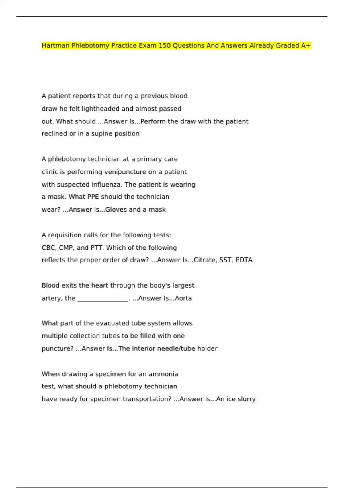Hartman Phlebotomy Practice Exam 150 Questions And Answers Already Graded A+