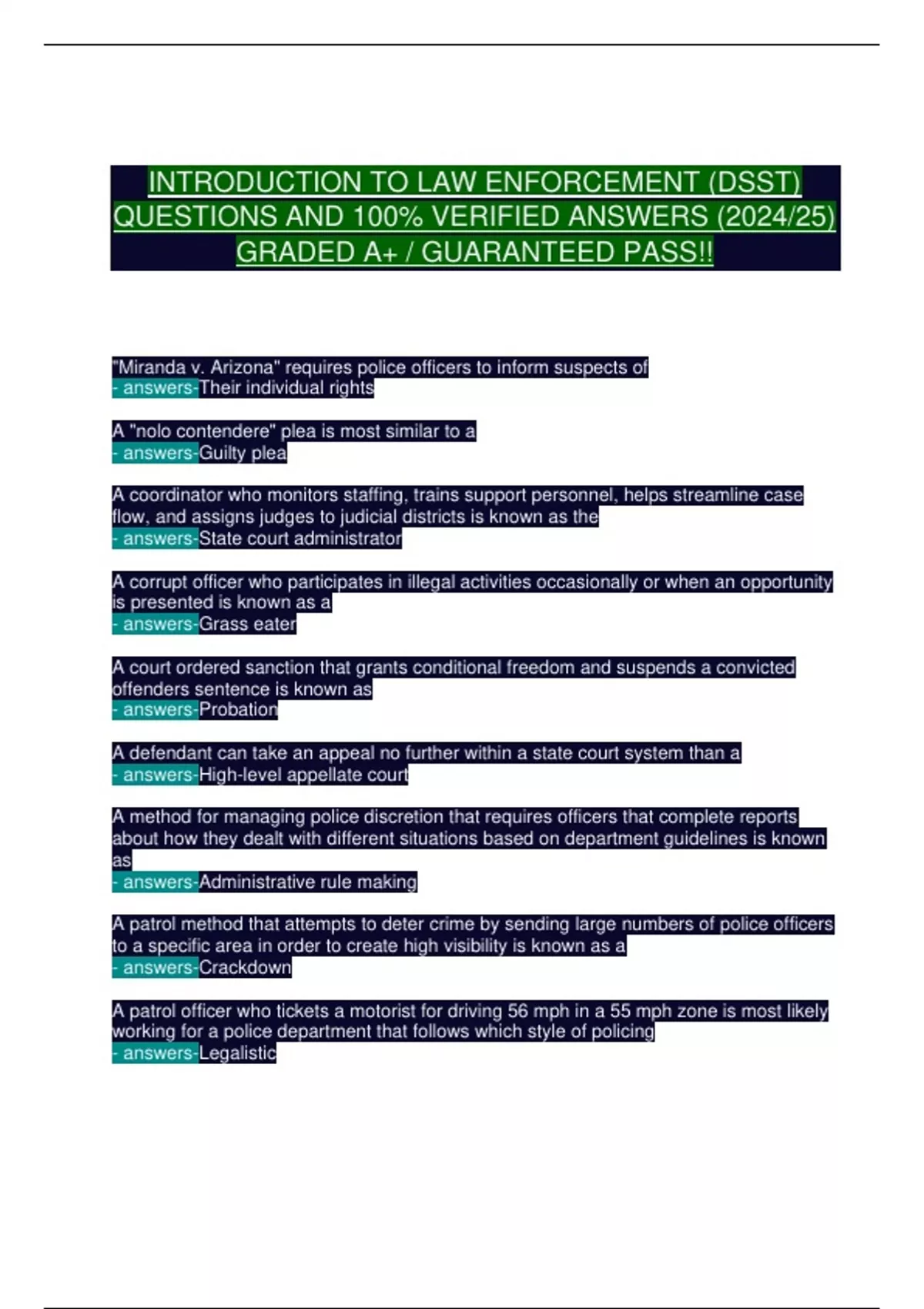 Ace Your Law Enforcement Exams with the Ultimate guide This 85-question practice exam is your 100% verified, A+ guaranteed key to mastering criminal justice and policing concepts! Updated for 2025, it covers every critical topic—from constitutional law and police procedures to community policing and criminal investigations. Why This Guide is Essential: 85 Realistic Exam Questions with detailed explanations Aligned with Criminal Justice Standards—perfect for police academies and CJ programs Quick-Reference Answers for efficient last-minute review Guaranteed Pass—trusted by thousands of law enforcement recruits Digital Download—study anytime, anywhere!