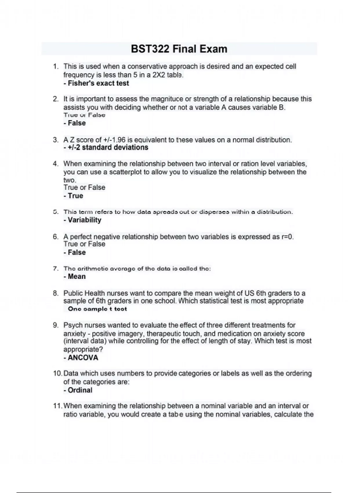 1. This is used when a conservative approach is desired and an expected cell frequency is less than 5 in a 2X2 table. - Fisher's exact test 2. It is important to assess the magnitude or strength of a relationship because this assists you with deciding whether or not a variable A causes variable B. True or False - False 3. A Z score of +/-1.96 is equivalent to these values on a normal distribution. - +/-2 standard deviations 4. When examining the relationship between two interval or ration level variables, you can use a scatterplot to allow you to visualize the relationship between the two. True or False - True 5. This term refers to how data spreads out or disperses within a distribution. - Variability 6. A perfect negative relationship between two variables is expressed as r=0. True or False - False 7. The arithmetic average of the data is called the: - Mean 8. Public Health nurses want to compare the mean weight of US 6th graders to a sample of 6th graders in one school. Which statistical test is most appropriate - One sample t-test 9. Psych nurses wanted to evaluate the effect of three different treatments for anxiety - positive imagery, therapeutic touch, and medication on anxiety score (interval data) while controlling for the effect of length of stay. Which test is most appropriate? - ANCOVA 10. Data which uses numbers to provide categories or labels as well as the ordering of the categories are: - Ordinal 11. When examining the relationship between a nominal variable and an interval or ratio variable, you would create a table using the nominal variables, calculate the mode and median of the interval or ratio variable, then make a decision regarding the relationship using the mode and median. True or False - False 12. Chi-square tests can be conducted for a 4X3 contingency table. True or False - True 13. Generally, an ANOVA test is used when 3 or more variables are compared. True or False - False 14. In a negative relationship, as the score of one variable decreases, the score on the second variable decreases. True or False - False 15. This is the measurement of dispersion equal to the square root of the mathematical variance. - Standard deviation 16. A formal statement that there is an absence of relationship between variables when tested by a researcher is called: - Null Hypothesis 17. The area of the theoretical distribution where the researcher will reject the null hypothesis is called: - Critical region 18. Bivariate statistics refers to the statistical analysis of the relationship between two variables. True or False - True 19. The difference between the highest and lowest score in a distribution is called: - Range 20. A significant finding with the 2 sample t-test indicates a strong relationship exists between the 2 population means. True or False - False 21. Relevant data that are expressed in numerical form are called: - Quantitative data