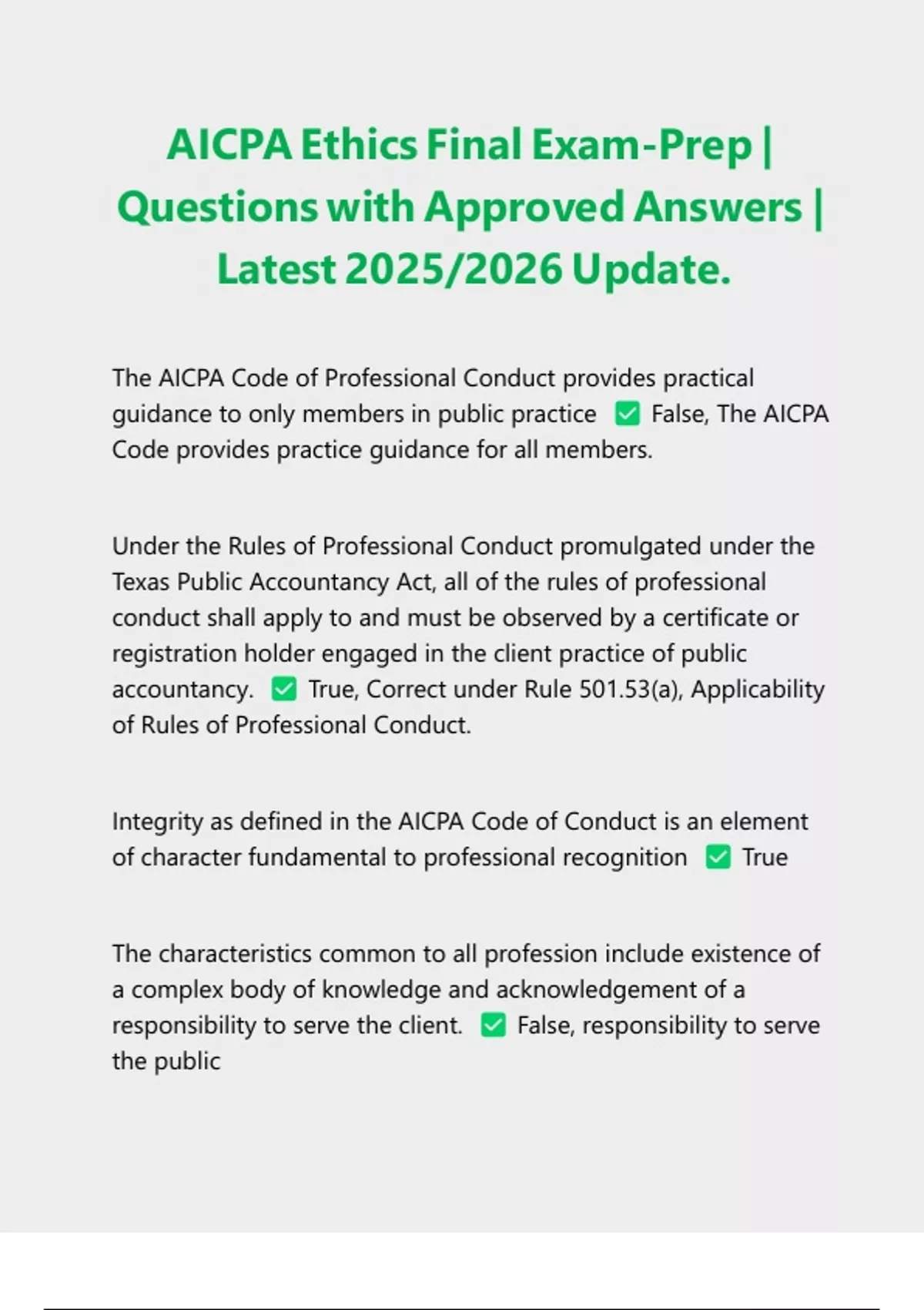 AICPA Ethics Final Exam-Prep | Questions with Approved Answers | Latest 2025/2026 Update. The AICPA Code of Professional Conduct provides practical guidance to only members in public practice False, The AICPA Code provides practice guidance for all members. Under the Rules of Professional Conduct promulgated under the Texas Public Accountancy Act, all of the rules of professional conduct shall apply to and must be observed by a certificate or registration holder engaged in the client practice of public accountancy. True, Correct under Rule 501.53(a), Applicability of Rules of Professional Conduct. Integrity as defined in the AICPA Code of Conduct is an element of character fundamental to professional recognition True The characteristics common to all profession include existence of a complex body of knowledge and acknowledgement of a responsibility to serve the client. False, responsibility to serve the public Membership in the AICPA is voluntary, but by accepting membership, a CPA assumes an obligation of self-discipline and agrees to adhere to the Code. True The AICPA Code of Professional Conduct begins with a preface that applies to all members. True The Responsibilities principle of the AICPA Code of Conduct requires that service and public trust not be subordinated to personal gain and advantage. False, This is integrity The AICPA Code of Professional Conduct provides assurance to clients and to the public that the professional intends to maintain high standards. True Generally, ethical dilemmas are not routine. Therefore, there is no way that an individual can be prepared or informed for a problem ahead of time. False, It is important that you do your homework and understand how to protect yourself and your employer. This will give you a "head's up" when you face potential ethical dilemmas PCAOB set auditing, quality control, ethics, independence and other standards relating to the preparation of audit reports. False, Only for Issuers The AICPA bylaws require that members adhere to the rules in the Code. True The American Institute of Certified Public Accountants has been the primary ethical rules for internal auditors. False