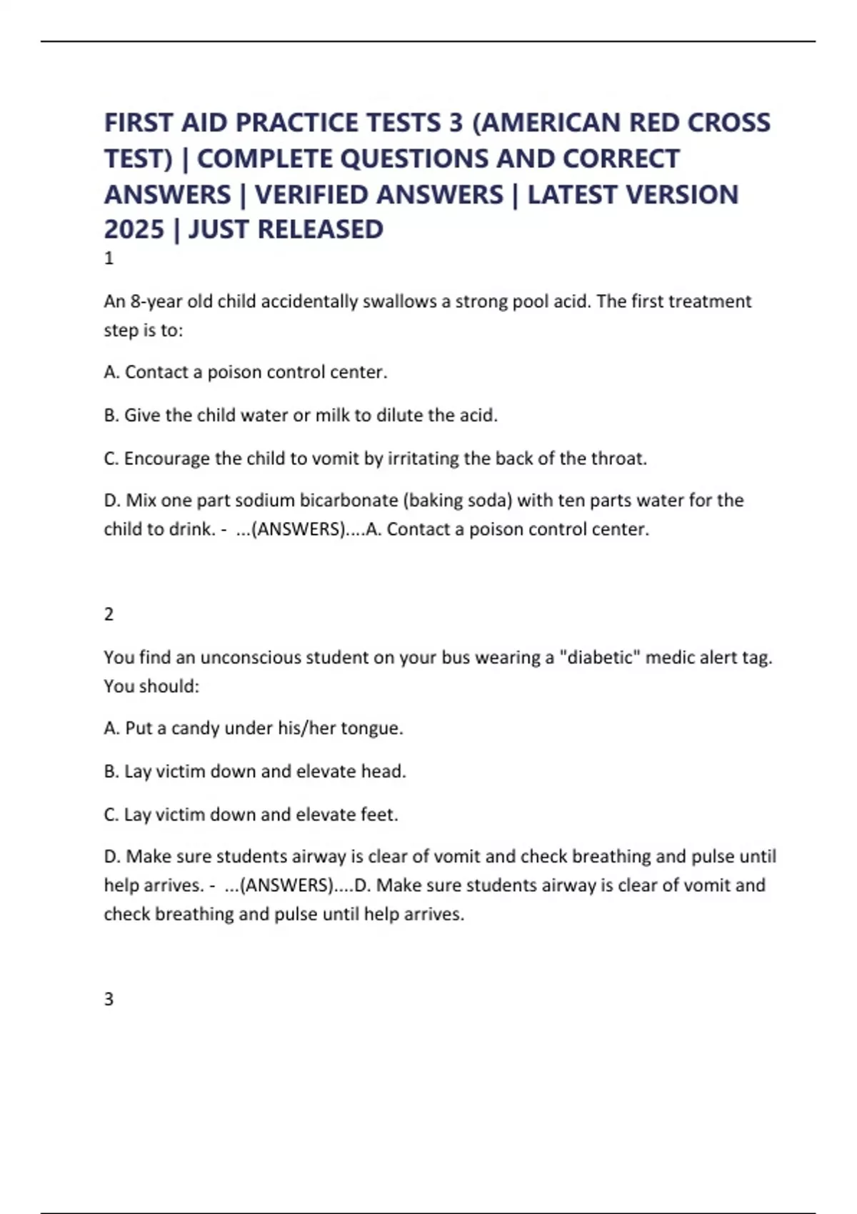 FIRST AID PRACTICE TESTS 3 (AMERICAN RED CROSS TEST) | COMPLETE QUESTIONS AND CORRECT ANSWERS | VERIFIED ANSWERS | LATEST VERSION 2025 | JUST RELEASED