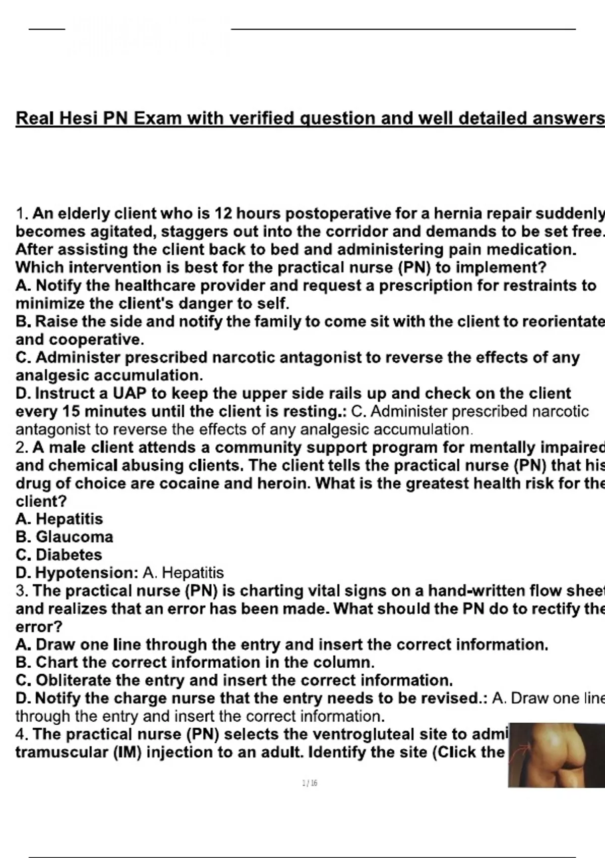 Real Hesi PN Exam with verified question and well detailed answers 1. An elderly client who is 12 hours postoperative for a hernia repair suddenly becomes agitated, staggers out into the corridor and demands to be set free. After assisting the client back to bed and administering pain medication. Which intervention is best for the practical nurse (PN) to implement? A. Notify the healthcare provider and request a prescription for restraints to minimize the client's danger to self. B. Raise the side and notify the family to come sit with the client to reorientate and cooperative. C. Administer prescribed narcotic antagonist to reverse the effects of any analgesic accumulation. D. Instruct a UAP to keep the upper side rails up and check on the client every 15 minutes until the client is resting.: C. Administer prescribed narcotic antagonist to reverse the effects of any analgesic accumulation. 2. A male client attends a community support program for mentally impaired and chemical abusing clients. The client tells the practical nurse (PN) that his drug of choice are cocaine and heroin. What is the greatest health risk for the client? A. Hepatitis B. Glaucoma C. Diabetes D. Hypotension: A. Hepatitis