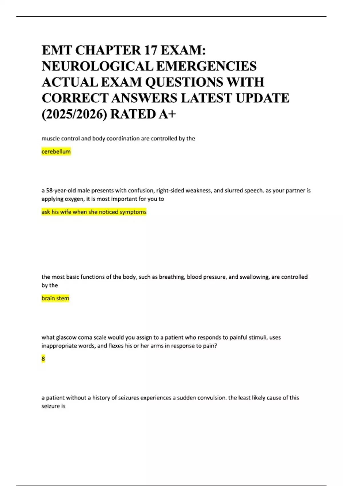 EMT CHAPTER 17 EXAM; NEUROLOGICAL EMERGENCIES ACTUAL EXAM QUESTIONS WITH CORRECT ANSWERS LATEST UPDATE () RATED A+.pdf