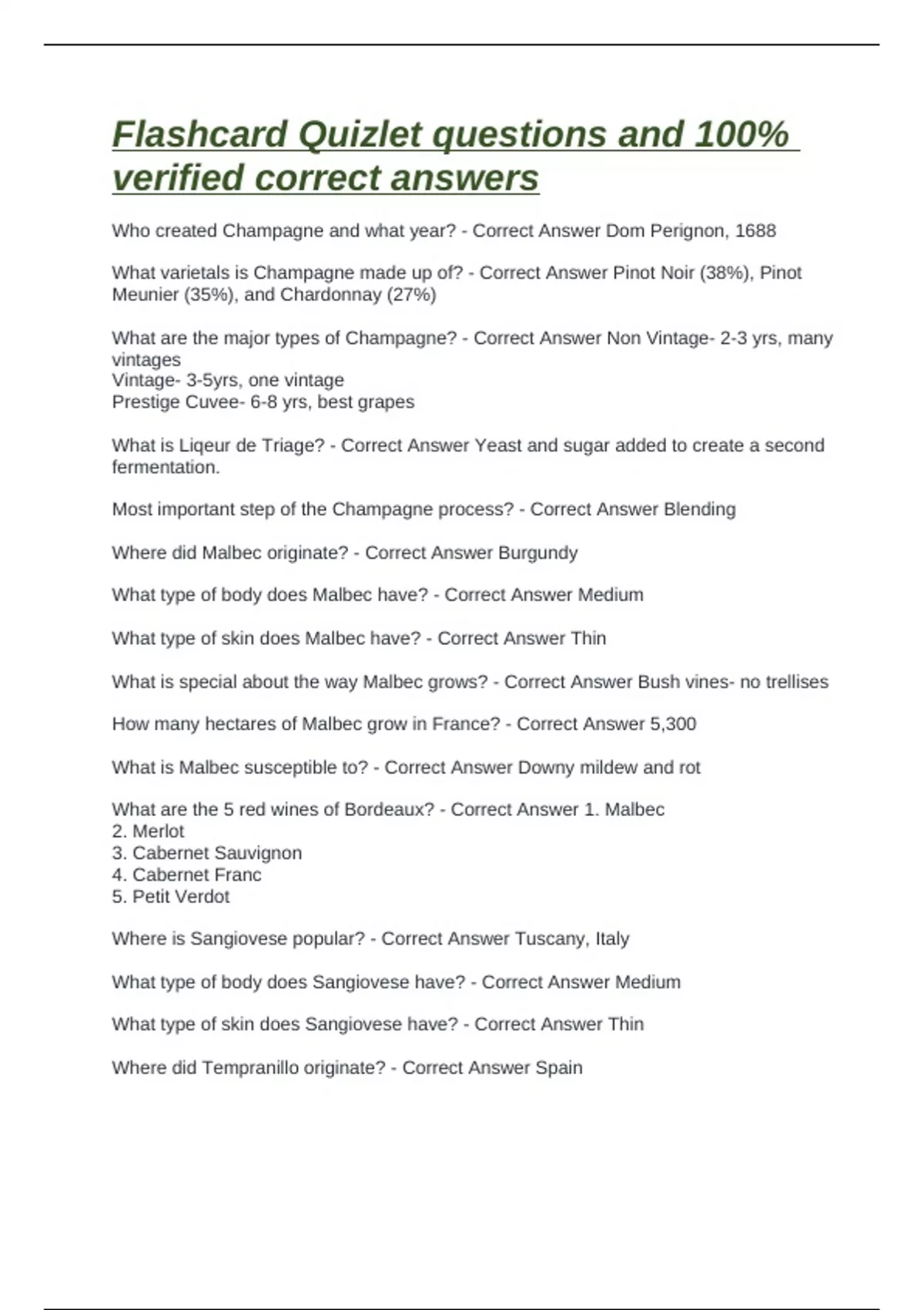 What varietals is Champagne made up of? - Correct Answer Pinot Noir (38%), Pinot