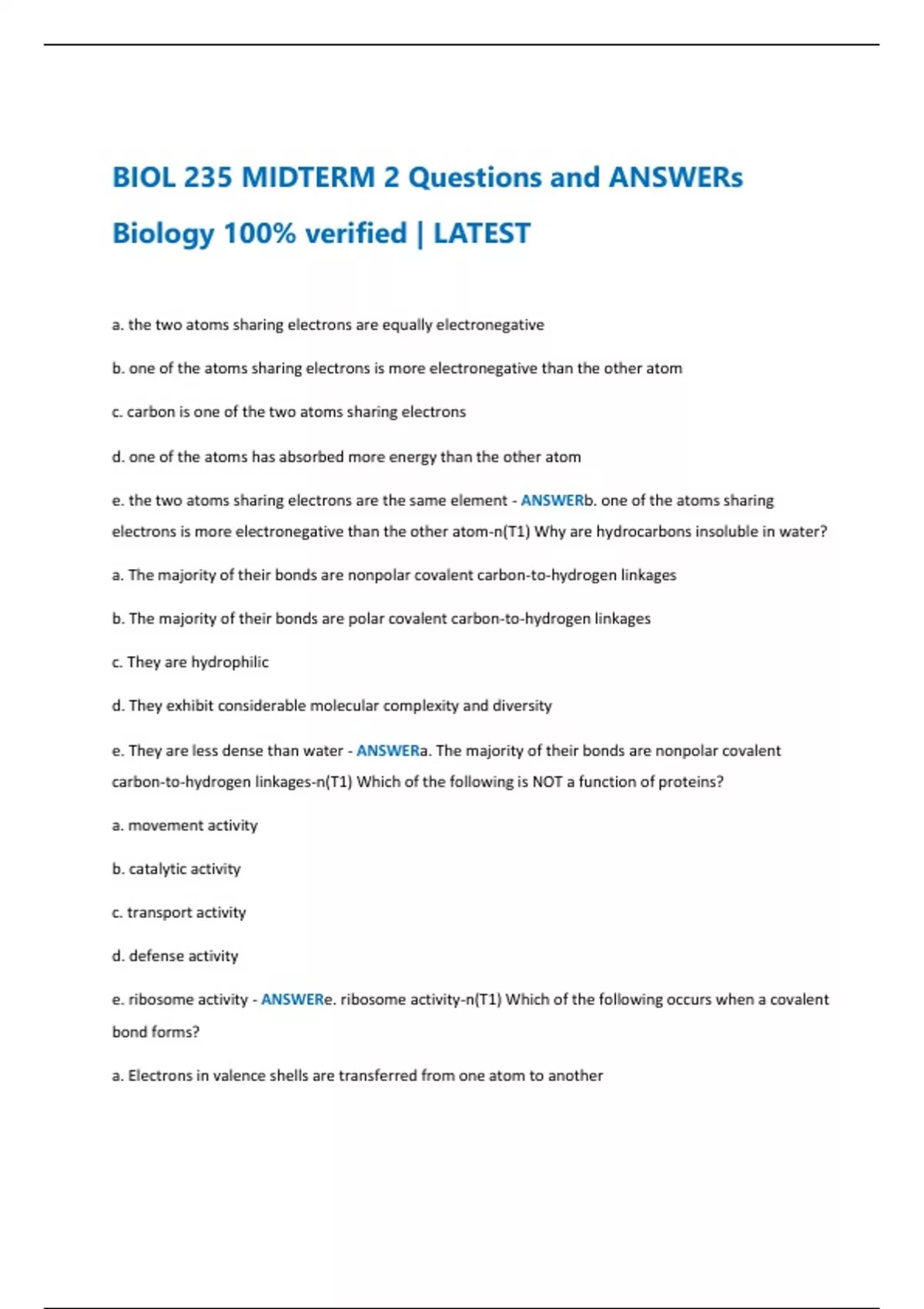 the two atoms sharing electrons are equally electronegative b. one of the atoms sharing electrons is more electronegative than the other atom c. carbon is one of the two atoms sharing electrons d. one of the atoms has absorbed more energy than the other atom e. the two atoms sharing electrons are the same element - ANSWERb. one of the atoms sharing electrons is more electronegative than the other atom-n(T1) Why are hydrocarbons insoluble in water? a. The majority of their bonds are nonpolar covalent carbon-to-hydrogen linkages b. The majority of their bonds are polar covalent carbon-to-hydrogen linkages c. They are hydrophilic d. They exhibit considerable molecular complexity and diversity e. They are less dense than water - ANSWERa. The majority of their bonds are nonpolar covalent carbon-to-hydrogen linkages-n(T1) Which of the following is NOT a function of proteins? a. movement activity b. catalytic activity c. transport activity d. defense activity e. ribosome activity - ANSWERe. ribosome activity-n(T1) Which of the following occurs when a covalent bond forms? a. Electrons in valence shells are transferred from one atom to another b. Electrons in valence shells are shared between atoms c. Partial charges on polar molecules interact d. Nonpolar molecules are pushed together by surrounded water molecules - ANSWERb. Electrons in valence shells are shared between atoms-n(T1) At which level of protein structure are interactions between the side chains (R-groups) most important? a. primary b. secondary c. tertiary d. quaternary e. primary, secondary, tertiary, and quaternary - ANSWERc. tertiary-n(T1) You disru