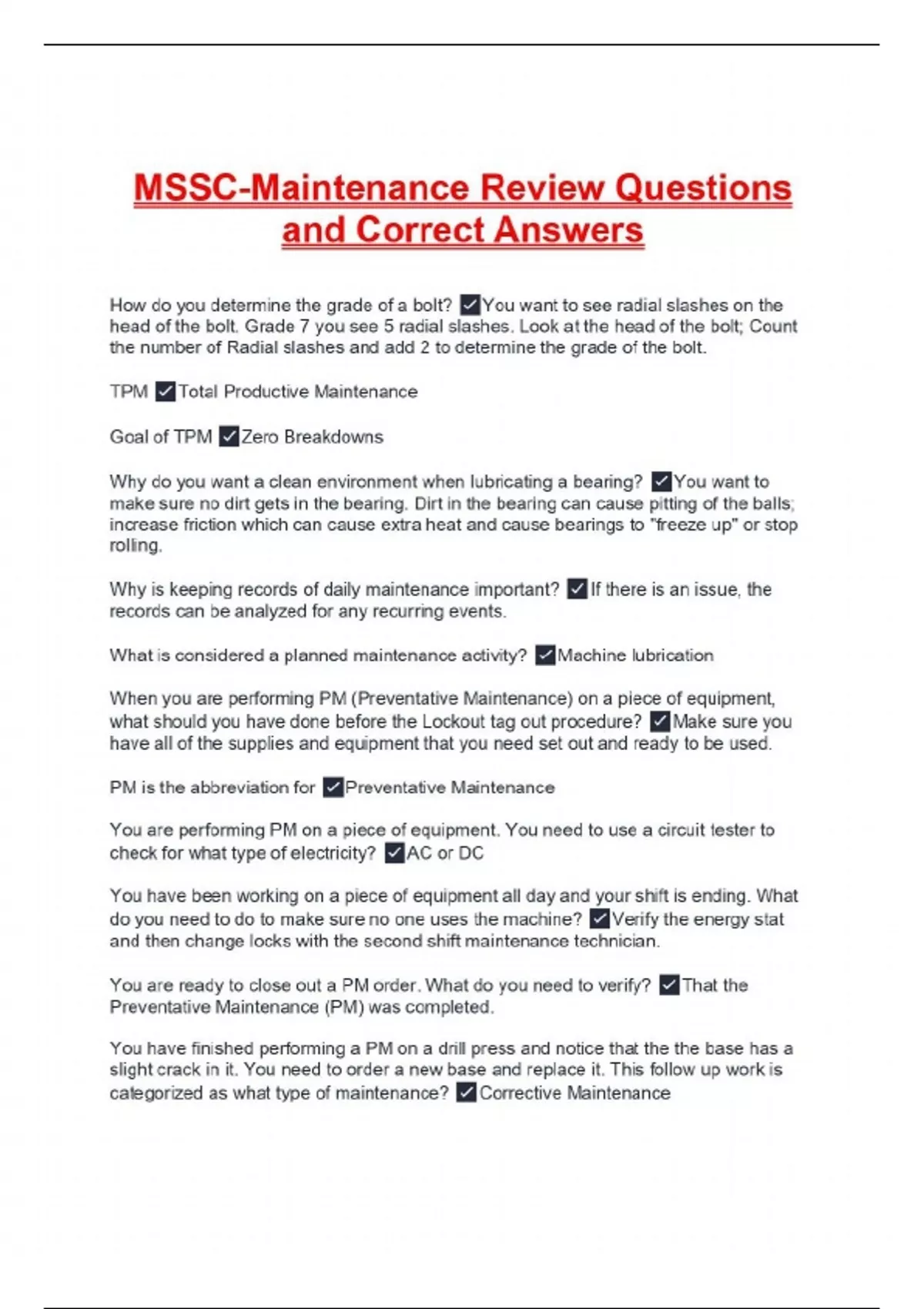 MSSC-Maintenance Review Questions and Correct Answers How do you determine the grade of a bolt? You want to see radial slashes on the head of the bolt. Grade 7 you see 5 radial slashes. Look at the head of the bolt; Count the number of Radial slashes and add 2 to determine the grade of the bolt. TPM Total Productive Maintenance Goal of TPM Zero Breakdowns Why do you want a clean environment when lubricating a bearing? You want to make sure no dirt gets in the bearing. Dirt in the bearing can cause pitting of the balls; increase friction which can cause extra heat and cause bearings to "freeze up" or stop rolling. Why is keeping records of daily maintenance important? If there is an issue, the records can be analyzed for any recurring events. What is considered a planned maintenance activity? Machine lubrication When you are performing PM (Preventative Maintenance) on a piece of equipment, what should you have done before the Lockout tag out procedure? Make sure you have all of the supplies and equipment that you need set out and ready to be used. PM is the abbreviation for Preventative Maintenance You are performing PM on a piece of equipment. You need to use a circuit tester to check for what type of electricity? AC or DC You have been working on a piece of equipment all day and your shift is ending. What do you need to do to make sure no one uses the machine? Verify the energy stat and then change locks with the second shift maintenance technician. You are ready to close out a PM order. What do you need to verify? That the Preventative Maintenance (PM) was completed. You have finished performing a PM on a drill press and notice that the the base has a slight crack in it. You need to order a new base and replace it. This follow up work is categorized as what type of maintenance? Corrective Maintenance What is Corrective Maintenance? Corrective maintenance is implemented right after a defect has been detected on a piece of equipment or a production line: its objective is to make the piece of equipment work normally again, so that it can perform its assigned function. Corrective maintenance can either be planned or unplanned depending on whether or not a maintenance plan has been created.