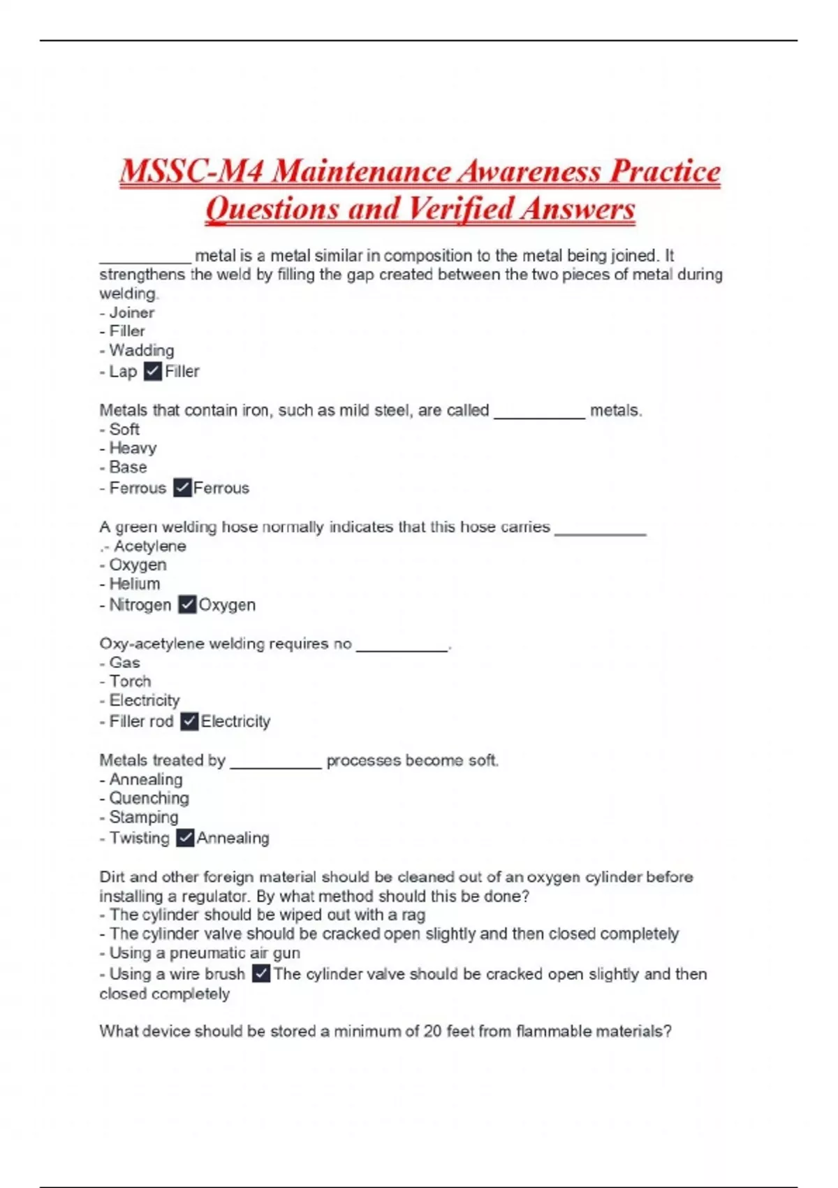 MSSC-M4 Maintenance Awareness Practice Questions and Verified Answers __________ metal is a metal similar in composition to the metal being joined. It strengthens the weld by filling the gap created between the two pieces of metal during welding. - Joiner - Filler - Wadding - Lap Filler Metals that contain iron, such as mild steel, are called __________ metals. - Soft - Heavy - Base - Ferrous Ferrous A green welding hose normally indicates that this hose carries __________ .- Acetylene - Oxygen - Helium - Nitrogen Oxygen Oxy-acetylene welding requires no __________. - Gas - Torch - Electricity - Filler rod Electricity Metals treated by __________ processes become soft. - Annealing - Quenching - Stamping - Twisting Annealing Dirt and other foreign material should be cleaned out of an oxygen cylinder before installing a regulator. By what method should this be done? - The cylinder should be wiped out with a rag - The cylinder valve should be cracked open slightly and then closed completely - Using a pneumatic air gun - Using a wire brush The cylinder valve should be cracked open slightly and then closed completely What device should be stored a minimum of 20 feet from flammable materials? - Nitrogen Cylinders - Micrometers - Machine Tools - Oxygen Cylinders - Oxygen Cylinders The gas metal arc welding (GMAW) process uses __________ to melt metal wire and fuse it with the base metal being welded. - Electricity - Oxygen - Acetylene - Tungsten Electricity Metals that contain iron, such as steel, have __________ properties. - Porous - Magnetic - Spongy - Kinetic Magnetic A magnaflux test is used to show what flaw in ferrous metal? - Flatness - Hardness - Cracks in the surface - Magnetism Cracks in the surface Metals that contain iron, such as steel are called __________ metals .- Ferrous - Soft - Base - Heavy Ferrous Torches are designed to avoid mixing oxygen and acetylene by using __________. - Reverse-flow check valves at torch inlets or regulator outlets - Separate valves - Lower oxygen pressure - Torch anti-mixing valve Reverse-flow check valves at torch inlets or regulator outlets An explosion can occur if __________ comes in contact with oil. - High pressure oxygen - High pressure nitrogen - High speed shaft - High speed pump High pressure oxygen A spot welding system consists of an electrical supply, moveable arm, and a(n) __________. - Encoder - Filler rod - Stationary arm - Stationary roller Stationary arm To prevent leakage around the valve during use, __________. - Acetylene pressure should be equalized - A full flow of oxygen should be established - An oxygen cylinder valve should be opened all the way - Reduce condensation in the regulator An oxygen cylinder valve should be opened all the way A __________ is a non-destructive test that uses a colored spray to reveal imperfections in a weld. - Dye-penetrant test - Magnaflux test - Bend test - X-ray test Dye-penetrant test The maximum pressure for use of acetylene gas is __________ psi. - 30 - 25 - 20 - 15 15 A red welding hose indicates that this hose carries __________. - Oxygen - Acetylene - Argon - Nitrogen Acetylene