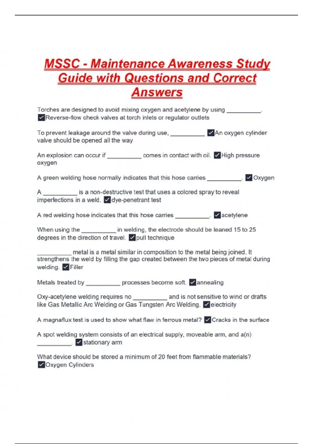 MSSC - Maintenance Awareness Study Guide with Questions and Correct Answers Torches are designed to avoid mixing oxygen and acetylene by using __________. Reverse-flow check valves at torch inlets or regulator outlets To prevent leakage around the valve during use, __________ An oxygen cylinder valve should be opened all the way An explosion can occur if __________ comes in contact with oil. High pressure oxygen A green welding hose normally indicates that this hose carries __________. Oxygen A __________ is a non-destructive test that uses a colored spray to reveal imperfections in a weld. dye-penetrant test A red welding hose indicates that this hose carries __________. acetylene When using the __________ in welding, the electrode should be leaned 15 to 25 degrees in the direction of travel. pull technique __________ metal is a metal similar in composition to the metal being joined. It strengthens the weld by filling the gap created between the two pieces of metal during welding. Filler Metals treated by __________ processes become soft. annealing Oxy-acetylene welding requires no __________ and is not sensitive to wind or drafts like Gas Metallic Arc Welding or Gas Tungsten Arc Welding. electricity A magnaflux test is used to show what flaw in ferrous metal? Cracks in the surface A spot welding system consists of an electrical supply, moveable arm, and a(n) __________. stationary arm What device should be stored a minimum of 20 feet from flammable materials? Oxygen Cylinders The gas metal arc welding (GMAW) process uses __________ to melt metal wire and fuse it with the base metal being welded. Electricity