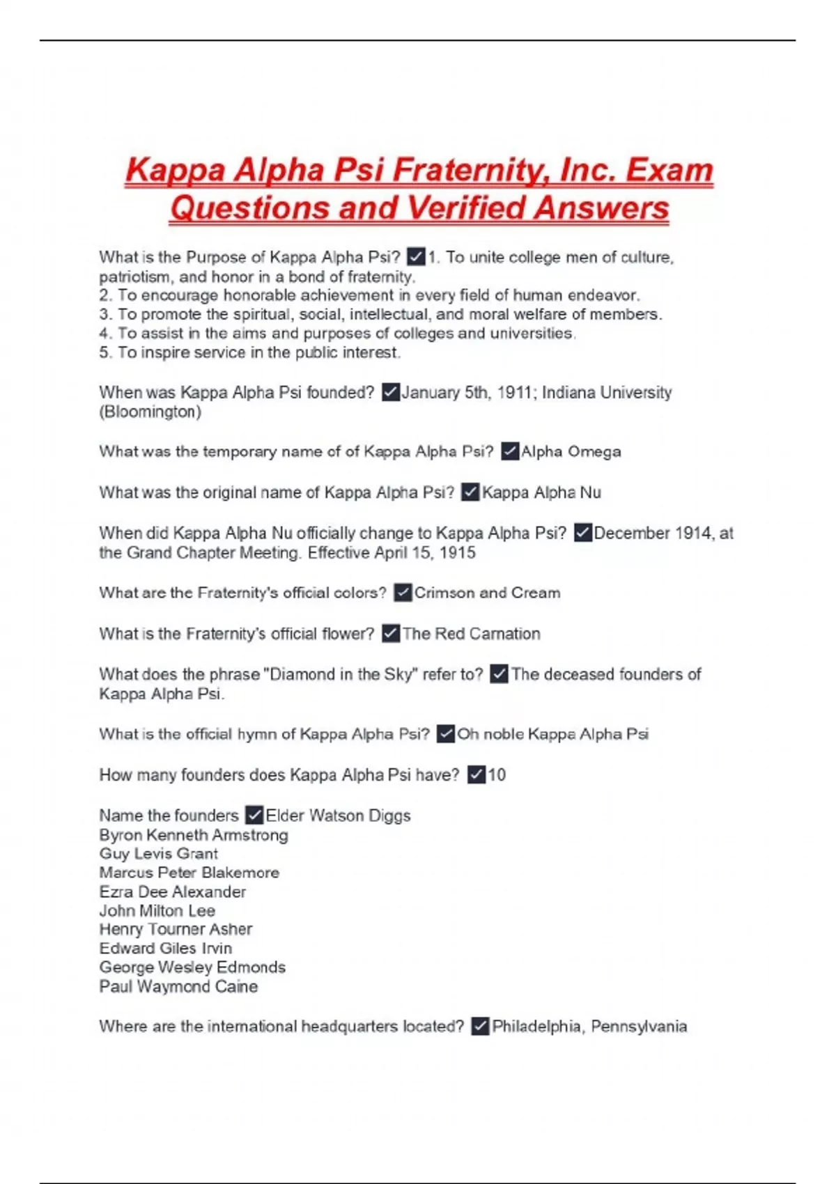 Kappa Alpha Psi Fraternity, Inc. Exam Questions and Verified Answers What is the Purpose of Kappa Alpha Psi? 1. To unite college men of culture, patriotism, and honor in a bond of fraternity. 2. To encourage honorable achievement in every field of human endeavor. 3. To promote the spiritual, social, intellectual, and moral welfare of members. 4. To assist in the aims and purposes of colleges and universities. 5. To inspire service in the public interest. When was Kappa Alpha Psi founded? January 5th, 1911; Indiana University (Bloomington) What was the temporary name of of Kappa Alpha Psi? Alpha Omega What was the original name of Kappa Alpha Psi? Kappa Alpha Nu When did Kappa Alpha Nu officially change to Kappa Alpha Psi? December 1914, at the Grand Chapter Meeting. Effective April 15, 1915 What are the Fraternity's official colors? Crimson and Cream What is the Fraternity's official flower? The Red Carnation What does the phrase "Diamond in the Sky" refer to? The deceased founders of Kappa Alpha Psi. What is the official hymn of Kappa Alpha Psi? Oh noble Kappa Alpha Psi How many founders does Kappa Alpha Psi have? 10 Name the founders Elder Watson Diggs Byron Kenneth Armstrong Guy Levis Grant Marcus Peter Blakemore Ezra Dee Alexander John Milton Lee Henry Tourner Asher Edward Giles Irvin George Wesley Edmonds Paul Waymond Caine Where are the international headquarters located? Philadelphia, Pennsylvania What is the address to the international headquarters? 2322 North Broad Street Philadelphia, Pennsylvania 19132 Grand Polemarch Jimmy McMikle Senior Grand Vice Polemarch Robert L. Jenkins, Jr., Esq. Junior Grand Vice Polemarch Jordan Smith Grand Keeper of Exchequer Rhen C. Bass, Sr. Grand Keeper of Records Kevin D. Kyles Grand Strategus Traylin Ball Grand Lt. Strategus Ryan Johnson Grand Historian Kevin P. Scott Grand Chapter Nominating Committee Chairman Michael F. Brown What does IHQ mean? International Headquarters When was the Wilmington Alumni Chapter founded? March 8, 1947 (Dover founded 1956) Charter Vignettes of Wilmington Alumni (17) Clarence C. Jones Dr. Lewis D. Giles Dr. Charles H. Butler John O. Hopkins George A. Johnson George L. Johnson Rev. John B. Redomond, Jr. Millard A. Naylor Dr. John H. Taylor Dr. Ideal William Edward Taylor Walter L. Pernell Rev. James A. Morgan Phillip Gooden Paul D. Haughton Oscar N. Smith D. Edward Fleming Richard Fleming