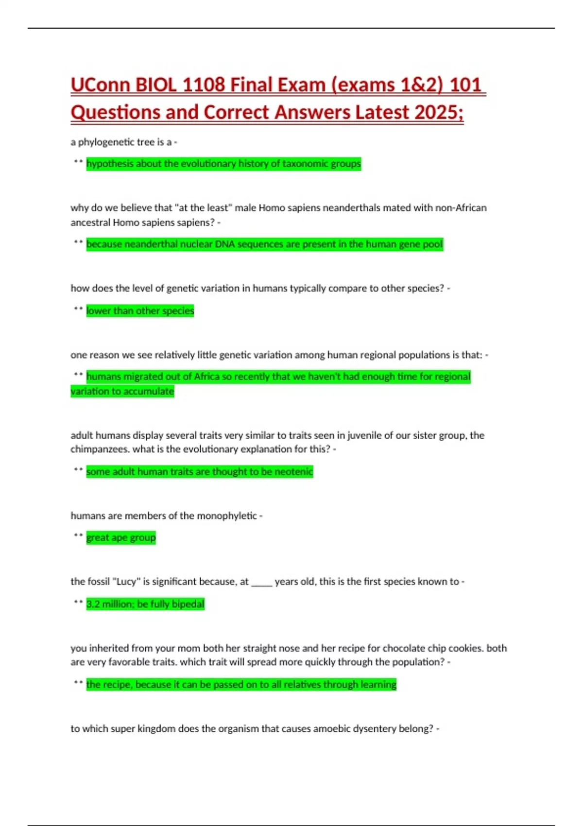UConn BIOL 1108 Final Exam (exams 1&2) 101 Questions and Correct Answers Latest 2025.