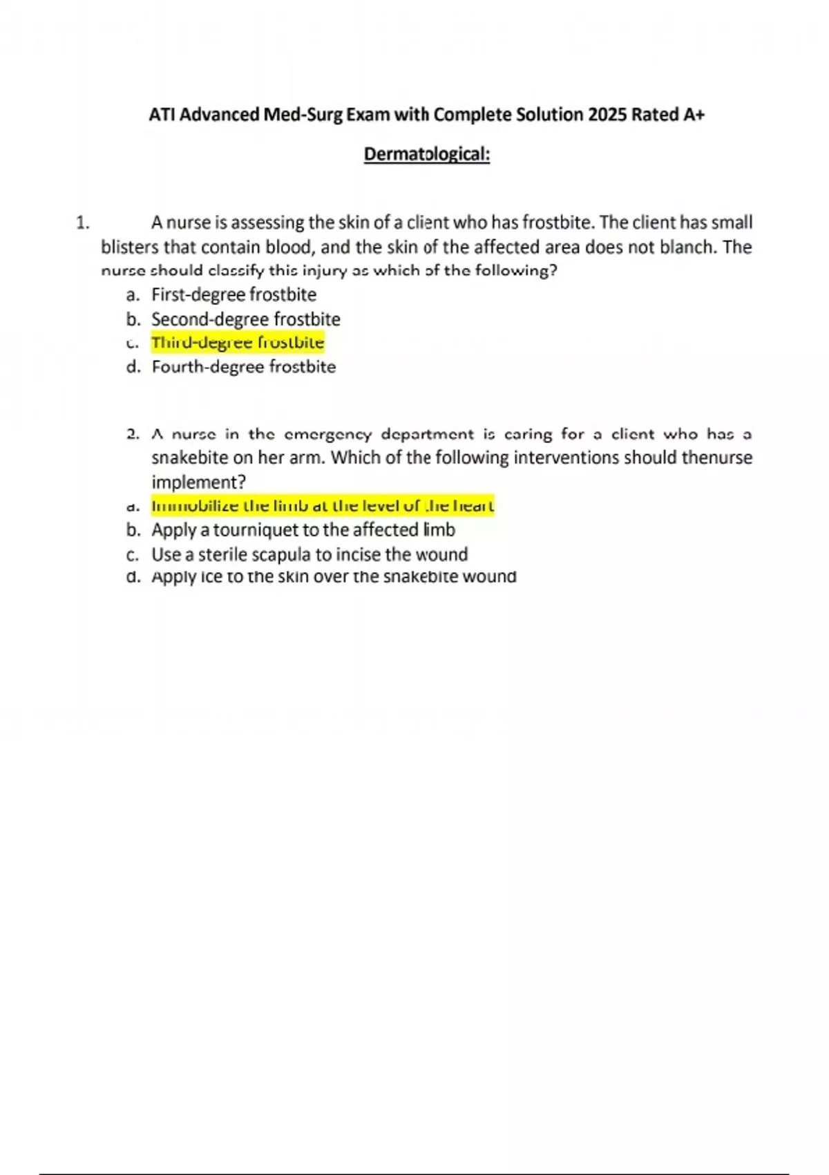 Dermatological: 1. A nurse is assessing the skin of a client who has frostbite. The client has small blisters that contain blood, and the skin of the affected area does not blanch. The nurse should classify this injury as which of the following? a. First-degree frostbite b. Second-degree frostbite c. Third-degree frostbite d. Fourth-degree frostbite 2. A nurse in the emergency department is caring for a client who has a snakebite on her arm. Which of the following interventions should thenurse implement? a. Immobilize the limb at the level of the heart b. Apply a tourniquet to the affected limb c. Use a sterile scapula to incise the wound d. Apply ice to the skin over the snakebite wound 3. A nurse is caring for an adolescent client who has burn wounds on her face and hands. Which of the following statements by the client indicates that she has adapted to her changed body image? a. “May I go with my family to the visitor’s lounge?” b. “I’ll see my friends when I get home” c. “My dad is coming to visit. Can you fix my hair for me?” d. “I told my cousins I’m in protective isolation.” 4. A nurse is assessing a client who is bedridden and was admitted from home. The nurse notes a shallow crater in the epidermis of the client’s sacral area. The nurse should document that the client has a pressure ulcer at which of the following stages? a. IV b. I c. III d. II 5. A nurse is teaching a client who has extensive deep partial- and full- thickness burns and requires a topical antimicrobial medication. The goal of this medication therapy is to reduce which of the following outcomes? a. Bacterial growth b. Scarring c. Skin graft size d. Pain 6. A nurse is planning care for a client who has deep partial-thickness and full- thickness thermal burns over 40% of his total body surface and is in the acute phase of burn injury. Which of the following interventions should the nurse include in the plan? a. Initiate range-of-motion exercises b. Use clean technique to provide wound care c. Place the client on a low-protein diet d. Maintain the client on bed rest 7. A nurse is providing teaching to a client who is wheelchair-bound and his caregiver about ways to reduce the risk of pressure ulcer formation. Which of the following instructions should the nurse include? a. “Move between the bed and the wheelchair once every 2 hr.” b. “Make sure that your caregiver massages your skin daily” c. “Use a rubber ring when sitting on the bedside.” d. “Shif t your weight in the wheelchair every 15 min.” 8. A nurse is evaluating the laboratory values of a client who is in the resuscitation phase following a major burn. Which of the following laboratory findings should the nurse expect? a. Hemoglobin 10 g/dL b. Sodium 132 mEq/L c. Albumin 3.6 g/dL d. Potassium 4.0 mEq/dL 9. A nurse in an emergency department is assessing a client who has extensive burns, including on her face. Which of the following assessments should the nurse perform first? a. Estimation of burn injury b. Characteristics of the cough and sputum c. Extent of peripheral edema d. Amount of urine output 10. A nurse in a provider’s office is caring for a client who has a new diagnosis of herpes zoster. The nurse should anticipate a prescription for which of the following medications? a. Zoster vaccine b. Acyclovir c. Amoxicillin d. Infliximab