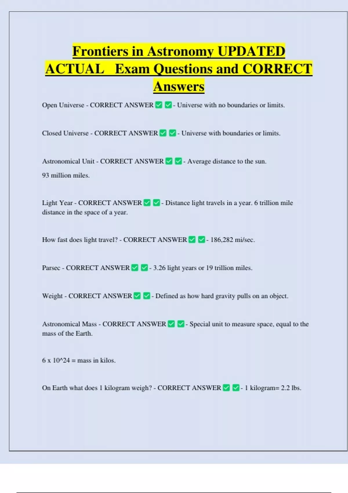 Frontiers in Astronomy UPDATED ACTUAL Exam Questions and CORRECT Answers Open Universe - CORRECT ANSWER Closed Universe - CORRECT ANSWER Astronomical Unit - CORRECT ANSWER 93 million miles. Light Year - CORRECT ANSWER distance in the space of a year. - Universe with no boundaries or limits. - Universe with boundaries or limits. - Average distance to the sun. - Distance light travels in a year. 6 trillion mile