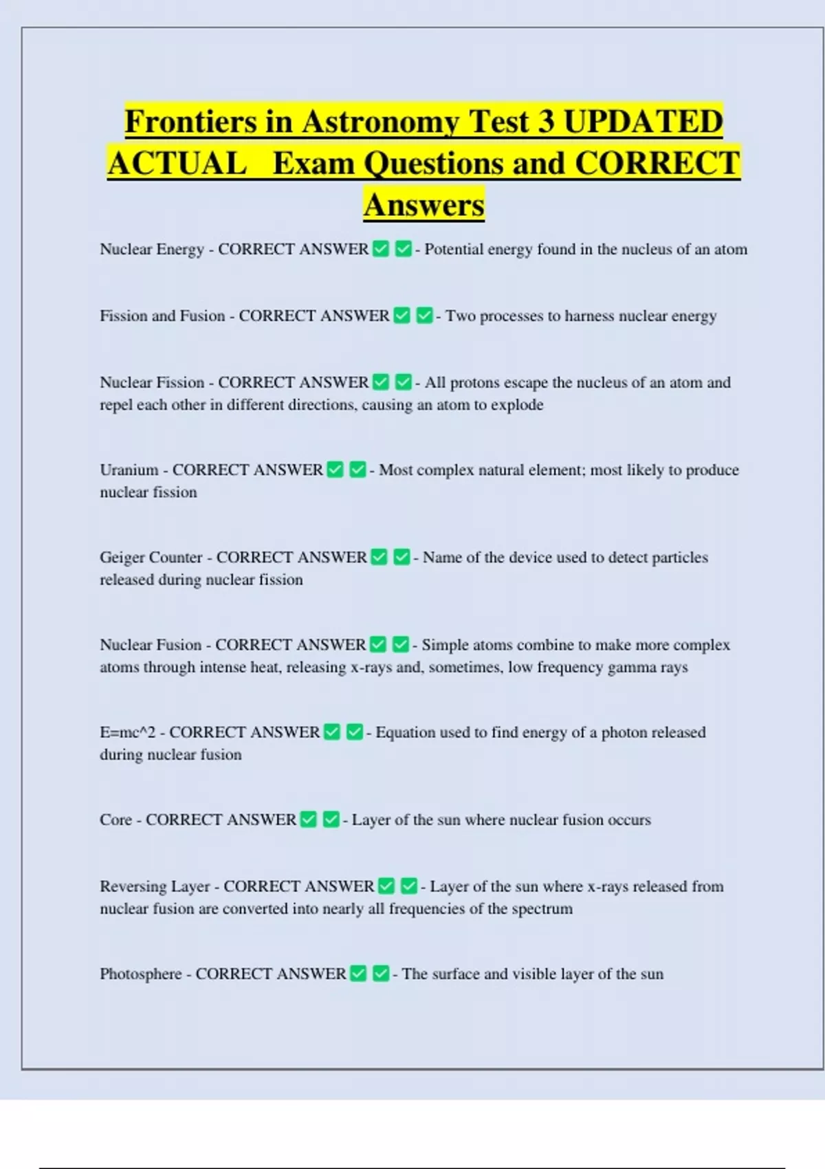 Frontiers in Astronomy Test 3 UPDATED ACTUAL Exam Questions and CORRECT Answers Nuclear Energy - CORRECT ANSWER Fission and Fusion - CORRECT ANSWER Nuclear Fission - CORRECT ANSWER - Potential energy found in the nucleus of an atom - Two processes to harness nuclear energy - All protons escape the nucleus of an atom and repel each other in different directions, causing an atom to explode Uranium - CORRECT ANSWER nuclear fission Geiger Counter - CORRECT ANSWER released during nuclear fission Nuclear Fusion - CORRECT ANSWER - Most complex natural element; most likely to produ