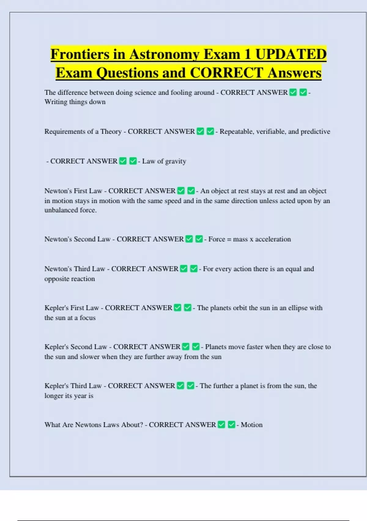Frontiers in Astronomy Exam 1 UPDATED Exam Questions and CORRECT Answers The difference between doing science and fooling around - CORRECT ANSWER Writing things down Requirements of a Theory - CORRECT ANSWER - - Repeatable, verifiable, and predictive - CORRECT ANSWER - Law of gravity Newton's First Law - CORRECT ANSWER - An object at rest stays at rest and an object in motion stays in motion with the same speed and in the same direction unless acted upon by a