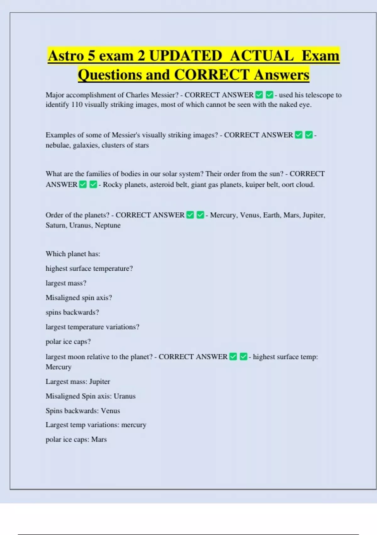 Astro 5 exam 2 UPDATED ACTUAL Exam Questions and CORRECT Answers Major accomplishment of Charles Messier? - CORRECT ANSWER - used his telescope to identify 110 visually striking images, most of which cannot be seen with the naked eye. Examples of some of Messier's visually striking images? - CORRECT ANSWER nebulae, galaxies, clusters of stars - What are the families of bodies in our solar system? Their order from the sun? - CORRECT ANSWER - Rocky planets, asteroid belt, giant gas planets, kuiper belt, oort cloud. Order of the planets? - CORRECT ANSWER Saturn, Uranus, Neptune Which planet has: highest surface temperature? largest mass? Misaligned spin axis? spins backwards? largest temperature variations? polar ice caps? - Mercury, Venus, Earth, Mars, Jupiter