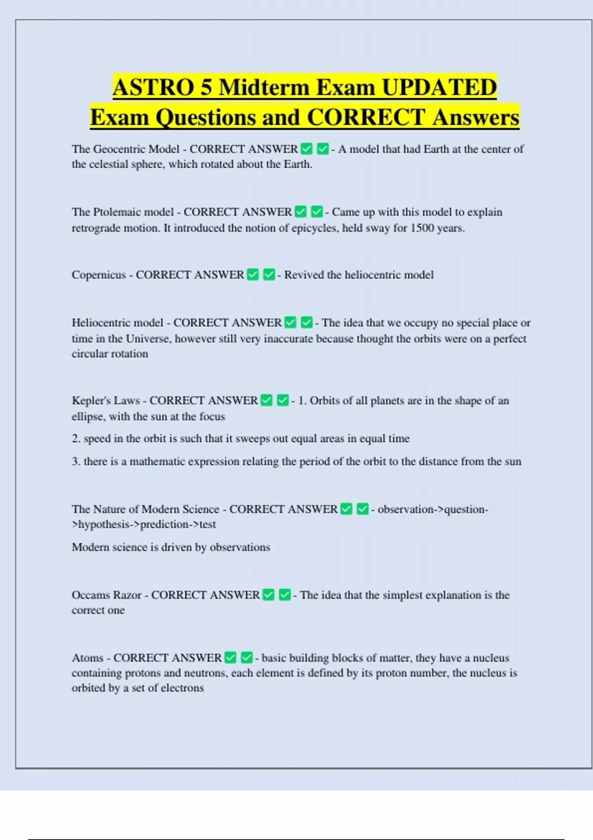 ASTRO 5 Midterm Exam UPDATED Exam Questions and CORRECT Answers The Geocentric Model - CORRECT ANSWER the celestial sphere, which rotated about the Earth. The Ptolemaic model - CORRECT ANSWER - A model that had Earth at the center of - Came up with this model to explain retrograde motion. It introduced the notion of epicycles, held sway for 1500 years. Copernicus - CORRECT ANSWER - Revived the heliocentric model Heliocentric model - CORRECT ANSWER - The idea that we occupy no special place or time in the Universe, however still very inaccurate because thought the orbits were on a perfect
