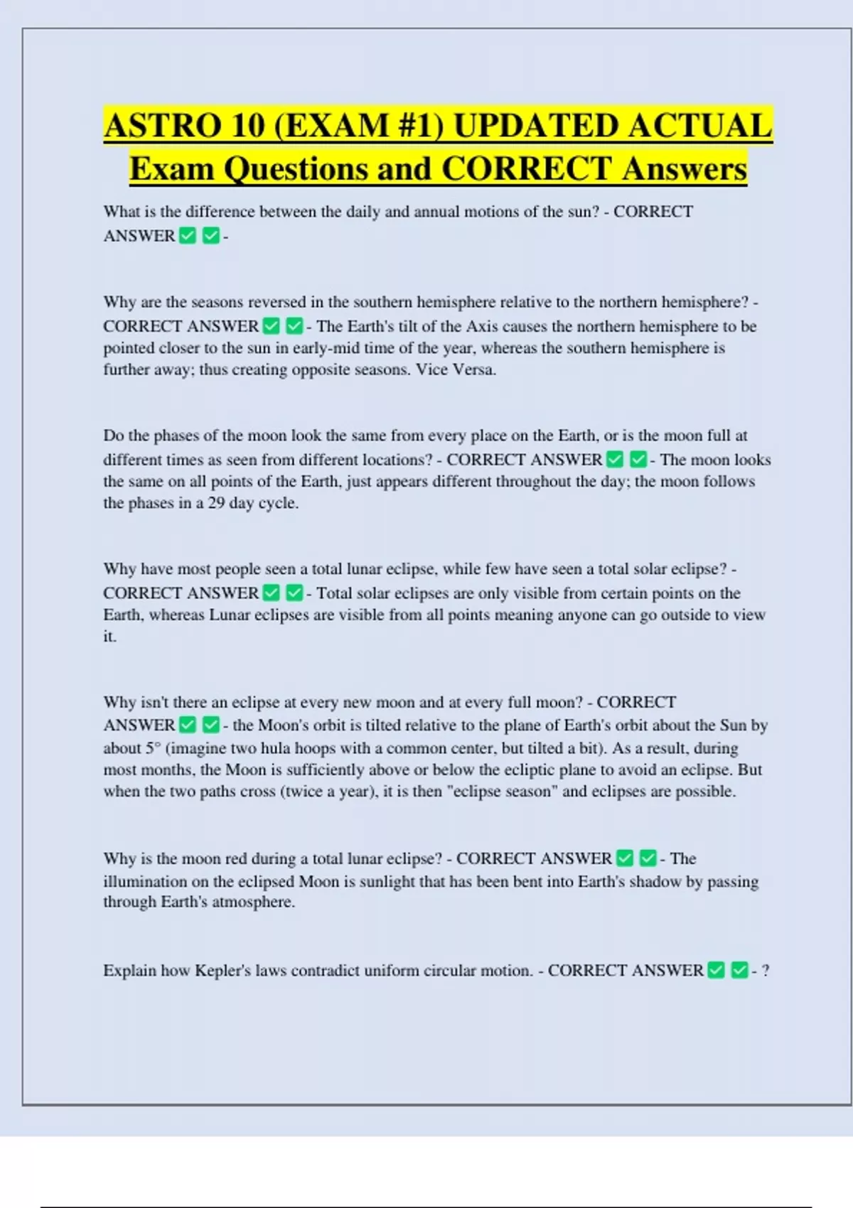 ASTRO 10 (EXAM #1) UPDATED ACTUAL Exam Questions and CORRECT Answers - What is the difference between the daily and annual motions of the sun? - CORRECT ANSWER Why are the seasons reversed in the southern hemisphere relative to the northern hemisphere? - CORRECT ANSWER - The Earth's tilt of the Axis causes the northern hemisphere to be pointed closer to the sun in early-mid time of the year, whereas the southern hemisphere is further away; thus creating opposite seasons. Vice Versa.