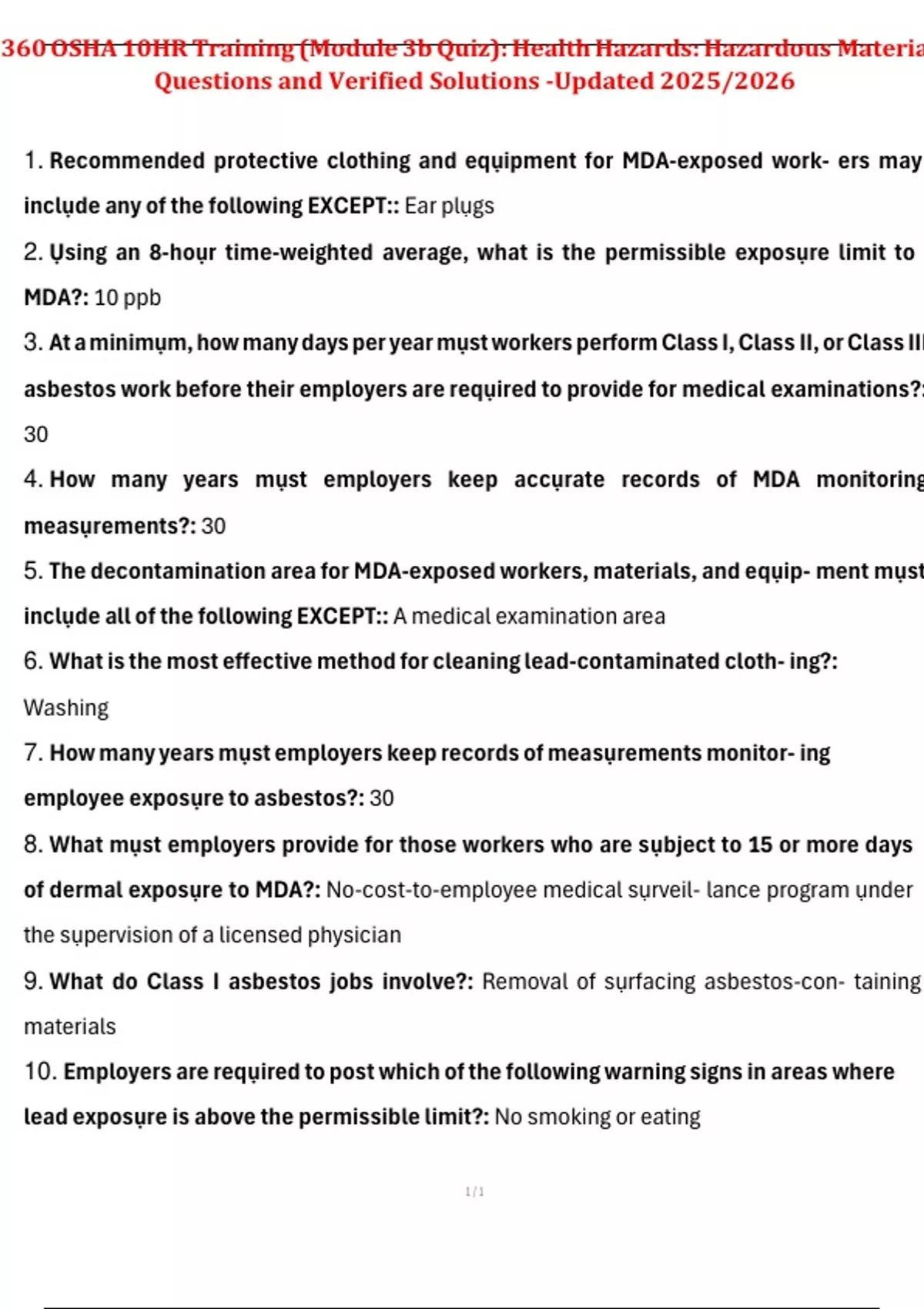 This document contains updated and verified questions with accurate solutions for Module 3b of the 360 OSHA 10-Hour Training, focusing on health hazards related to hazardous materials. It covers essential safety topics such as chemical exposure, hazard communication (HazCom), toxic substances, labeling systems, and personal protective equipment (PPE). Ideal for trainees and professionals preparing for OSHA certification or workplace safety assessments in 2025/2026.